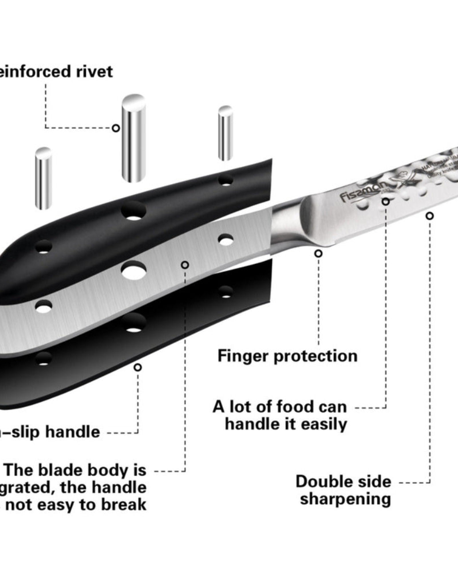 | * شفرة من الفولاذ الياباني (420J2): متينة ومقاومة للتآكل ومقاومة للتآكل مع صلابة 53±2 HRC - مثالية للبيئات ذات الرطوبة العالية. * لمسة نهائية للشفرة المطروقة: تمنع الطعام من الالتصاق بالشفرة، مما يضمن تقطيعًا سلسًا وفعالًا. * مقبض ABS مريح: مقبض غير لامع، مقاوم للانزلاق، مثبت بشكل آمن بثلاثة مسامير لتحقيق الاستقرار والتحكم. |