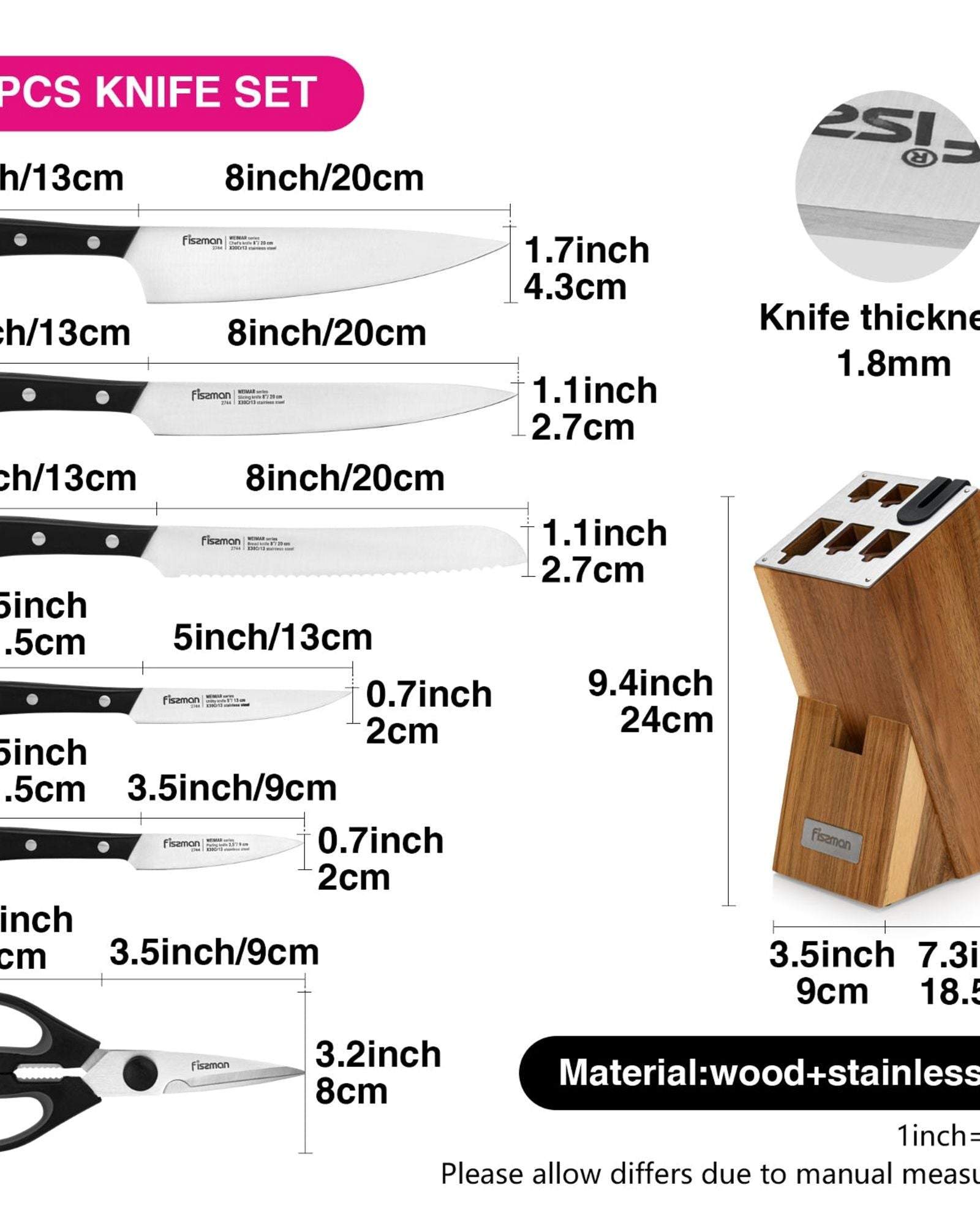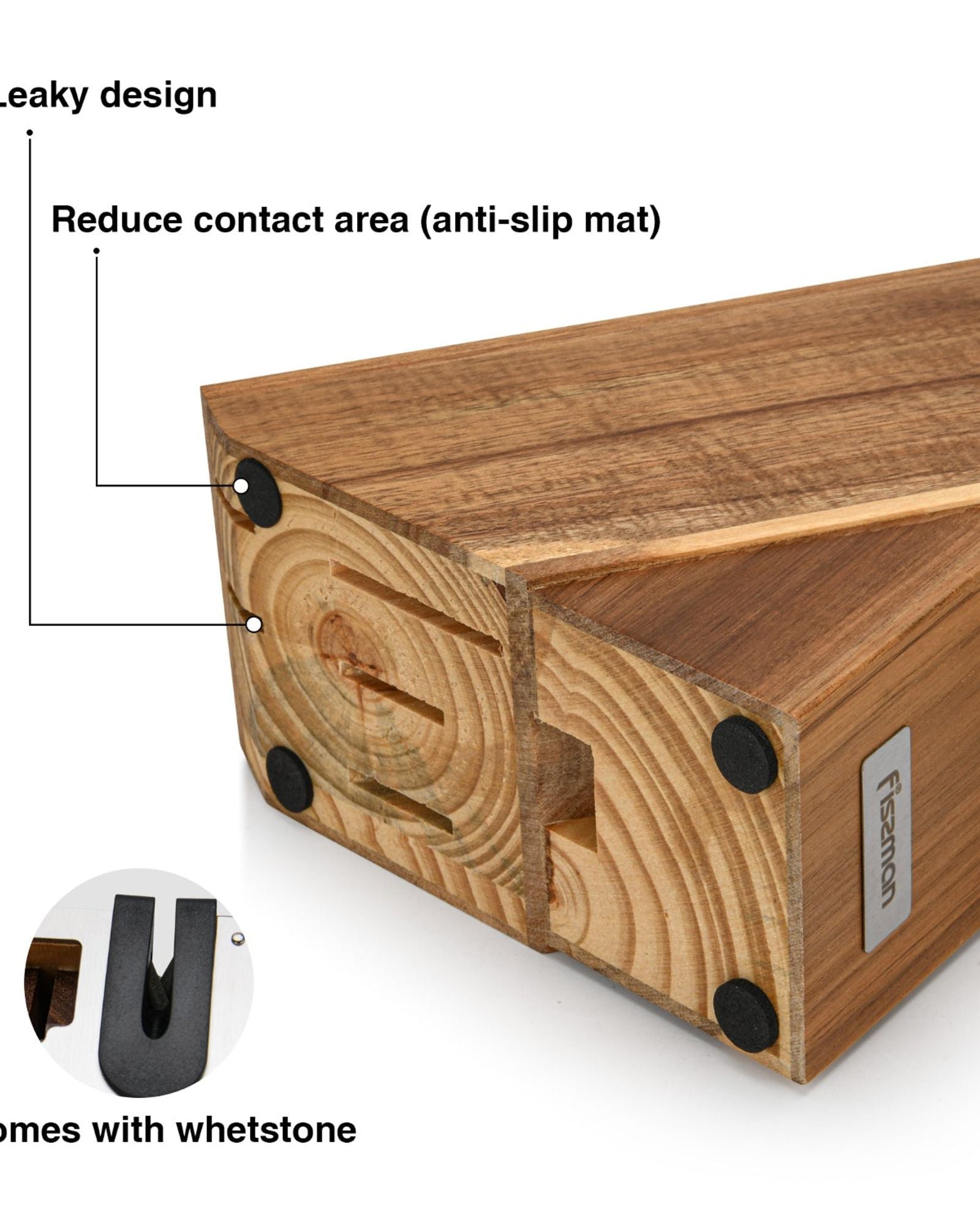 * تصميم مبتكر لحامل خشبي: الحامل مصنوع من خشب الأكاسيا الصلب بلون طبيعي، يجمع بين التصميم الكلاسيكي والابتكار. يندمج بسلاسة مع ديكور المطبخ، ويضمن تخزينًا آمنًا، ويوفر المساحة. المبراة المدمجة بأحجار الماس تحافظ على حدة السكين، مما يوفر راحةً للمستخدمين.