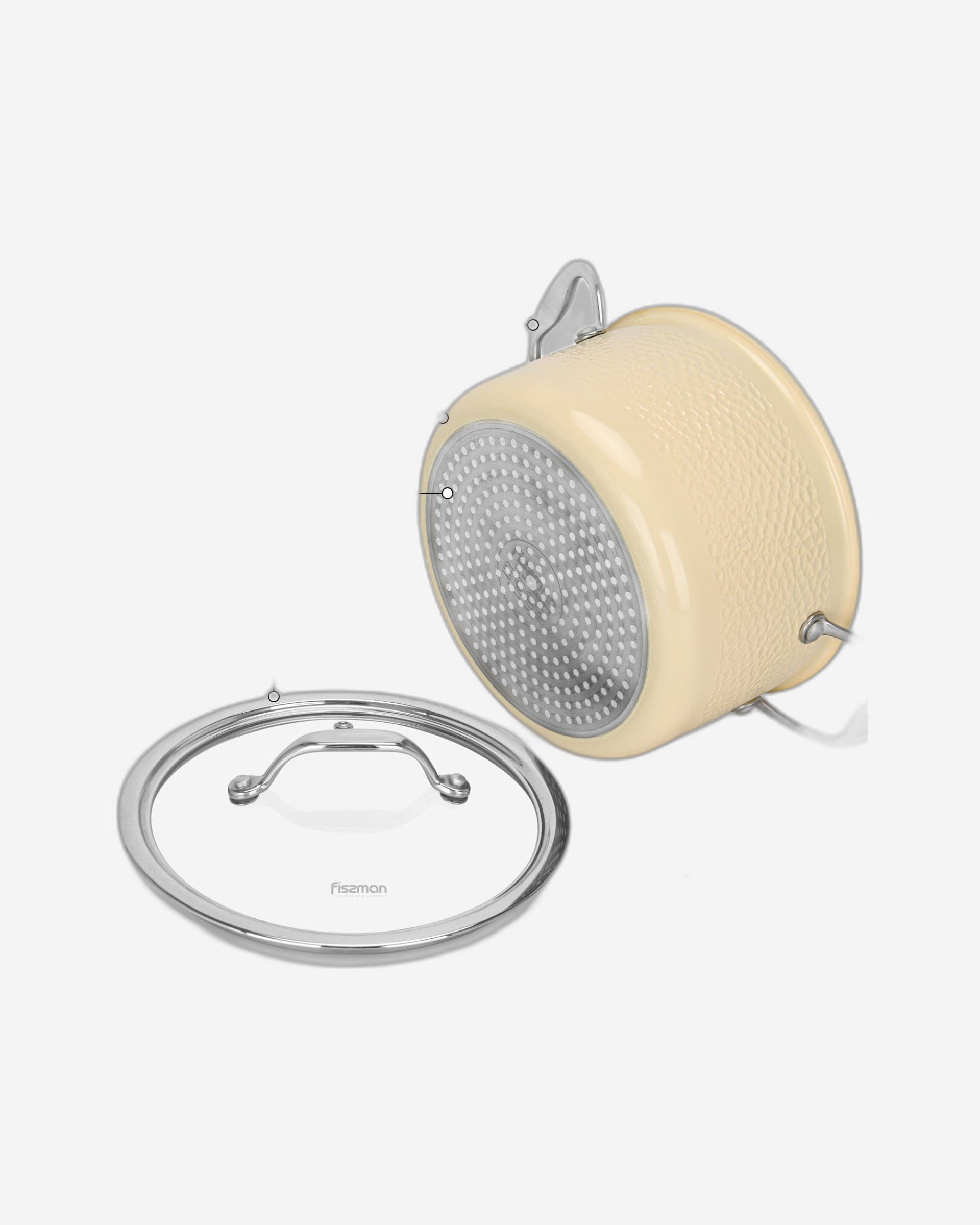 سلسلة بريجيت الجديدة هي من إبداع مصممي وتقنيي فيسمان. سمح لنا هذا الإنتاج المعقد والفريد بدمج مادتين في تحفة فنية واحدة وتقديم سلسلة لا مثيل لها. سلسلة أواني طهي بريجيت ثنائية الطبقات: طبقة داخلية من الفولاذ المقاوم للصدأ 18/10 (INOX304) عالي الجودة، وطبقة خارجية من الألومنيوم، مع طلاء HAMMER الأصلي المقاوم للحرارة بلون الكريم الأصلي. يضمن السُمك الأمثل للطبقات توزيعًا سريعًا ومتساويًا للحرارة من جميع أنواع المواقد، بما في ذلك المواقد الحثيثة. جسم مكون من طبقتين (طبقة داخلية من الفولاذ المقاوم للصدأ 18/10 (INOX304) عالي الجودة وطبقة خارجية من الألومنيوم) طلاء مقاوم للحرارة مطرقة بلون الكريم قاعدة حثية متعددة الطبقات لتوزيع مثالي للحرارة علامات القياس (للتحكم في حجم السائل) غطاء زجاجي شفاف مقاوم للصدمات يسمح لك بمراقبة جاهزية الطعام دون فتح الغطاء لمنع تناثر السوائل على الجلد والملابس قبضة أنيقة ومريحة مقابض من الفولاذ المقاوم للصدأ مثبتة بمسامير تصميم أنيق وأصلي أعلى معيار للجودة موفر للطاقة معتمد من قبل الطهاة المحترفين آمن للصحة وصديق للبيئة من خلال اختيار أواني الطهي المصنوعة من الفولاذ المقاوم للصدأ ذات العلامة التجارية من FISSMAN، يمكنك التأكد من أعلى معيار للجودة وسهولة الاستخدام. بالإضافة إلى ذلك، يضيف التصميم الأصلي الأنيق جمالاً إلى أي مطبخ.