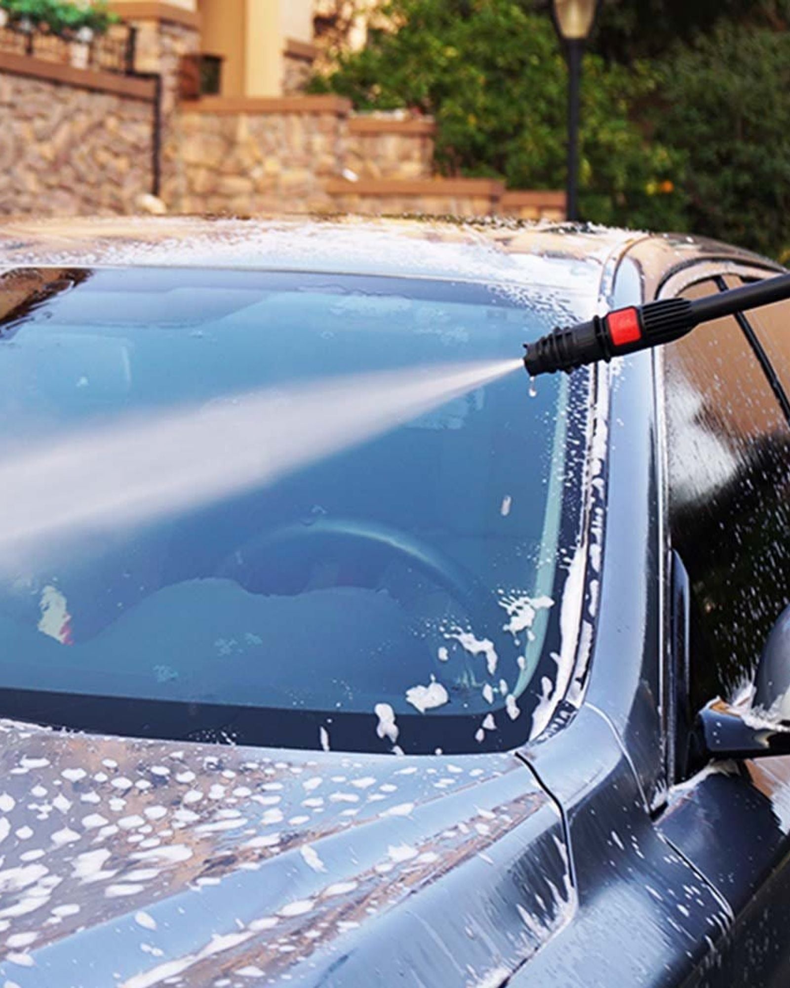 * الملحقات تشمل: موزع الرغوة، مقبض الزناد، خرطوم الضغط، فوهة الضغط العالي، فرشاة السيارة، ملحق الرمح وفرشاة الحافات