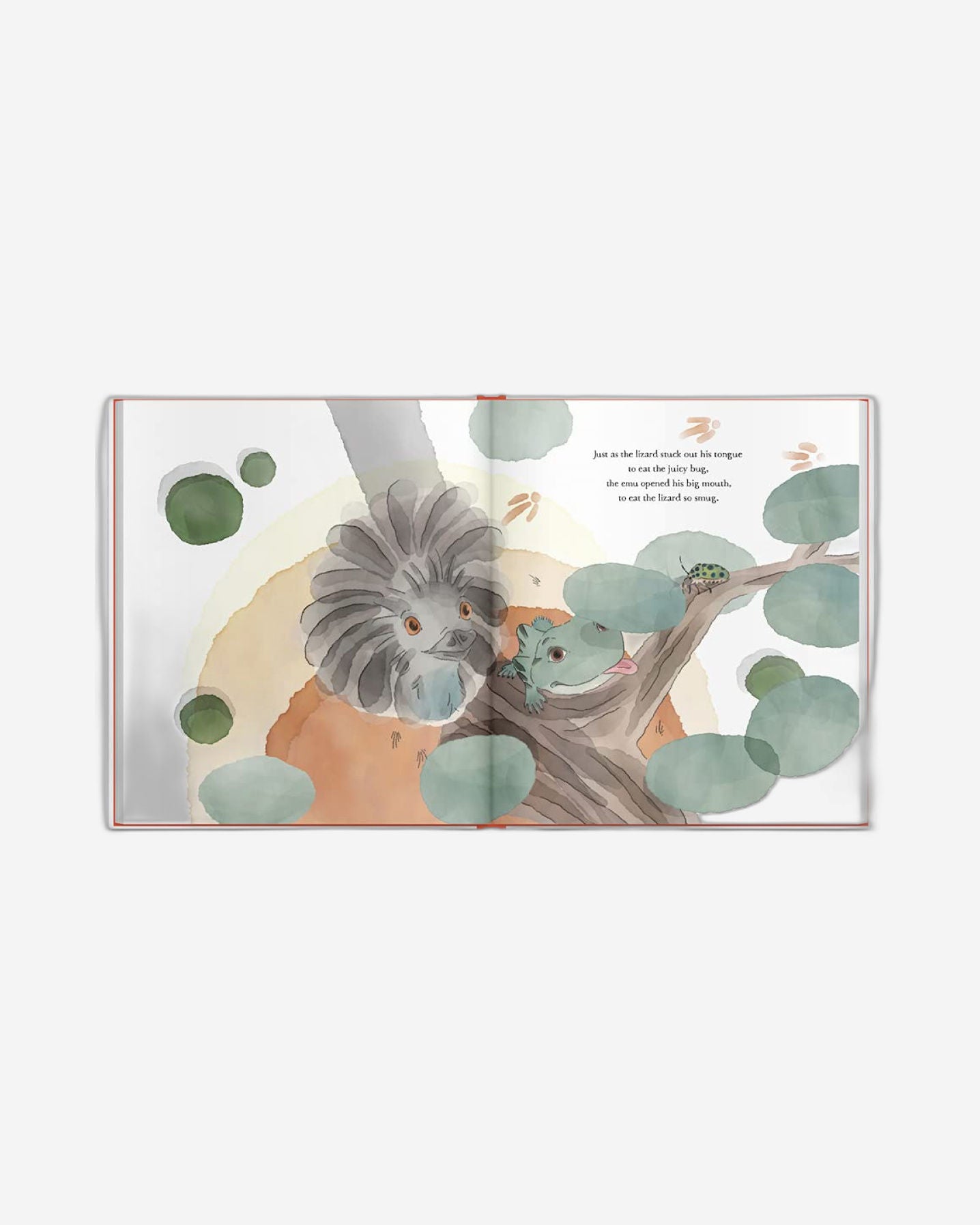 يبحثون جميعًا عن بعض الظل والطعام في يومٍ شديد الحرارة. يراقب الكوالا، مستمتعًا بأوراق الكينا، الأحداث من حوله. ثم تدخل حشرة، وسحلية تنين الماء، وإيمو، وأم كنغر مع كلبها جوي، القصة. شاهد ما يحدث في النهاية ويثير إعجابًا طريفًا بينهما في هذه السافانا الصحراوية المشمسة.