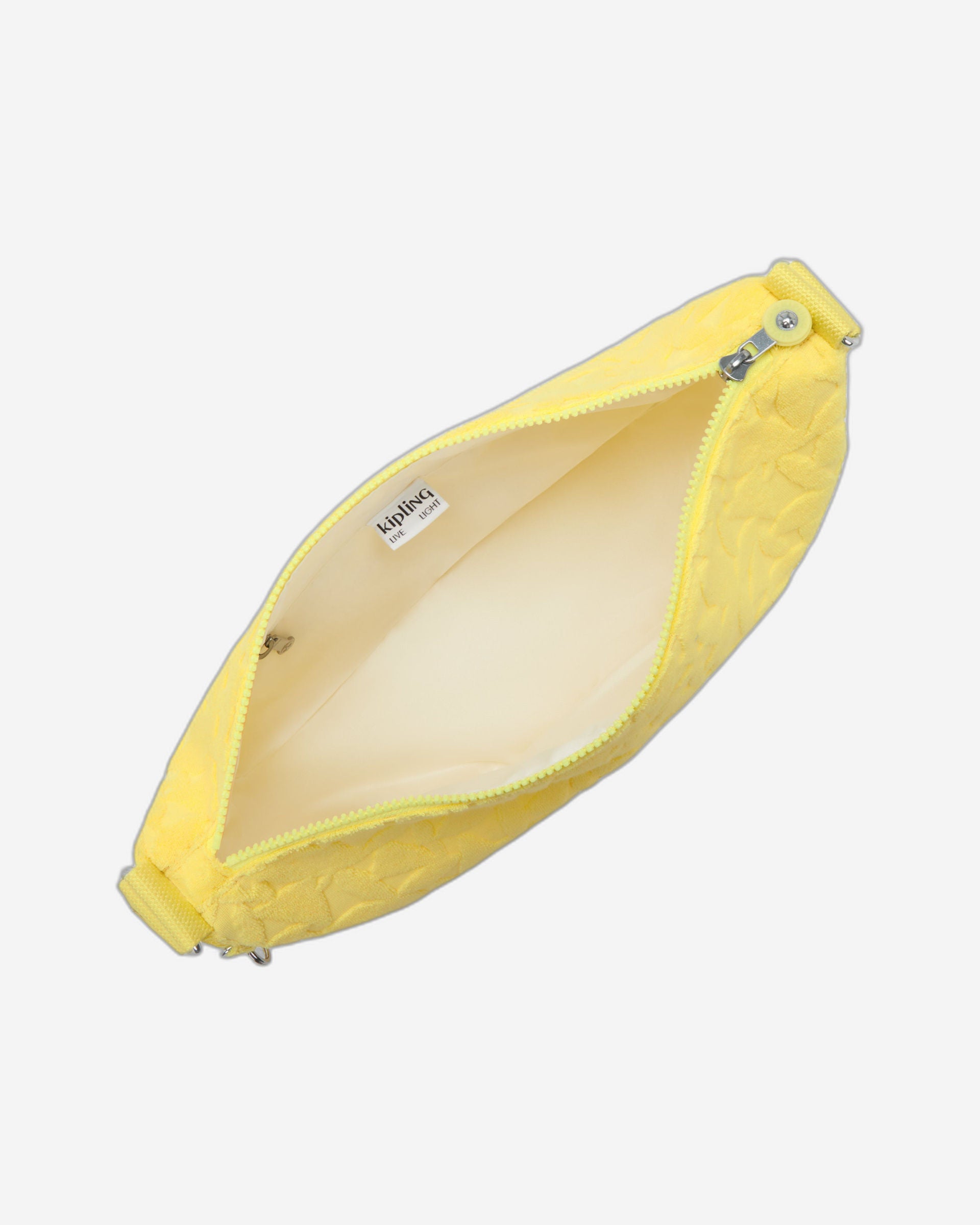 حقيبة كروس بودي هلالية الشكل، مصنوعة من قماش تيري الفاخر، مثالية للأيام الدافئة. نقشة أشجار النخيل الناعمة المنقوشة تجعلها الخيار الأمثل لقضاء عطلة على الشاطئ أو لقضاء يوم مع الأصدقاء.