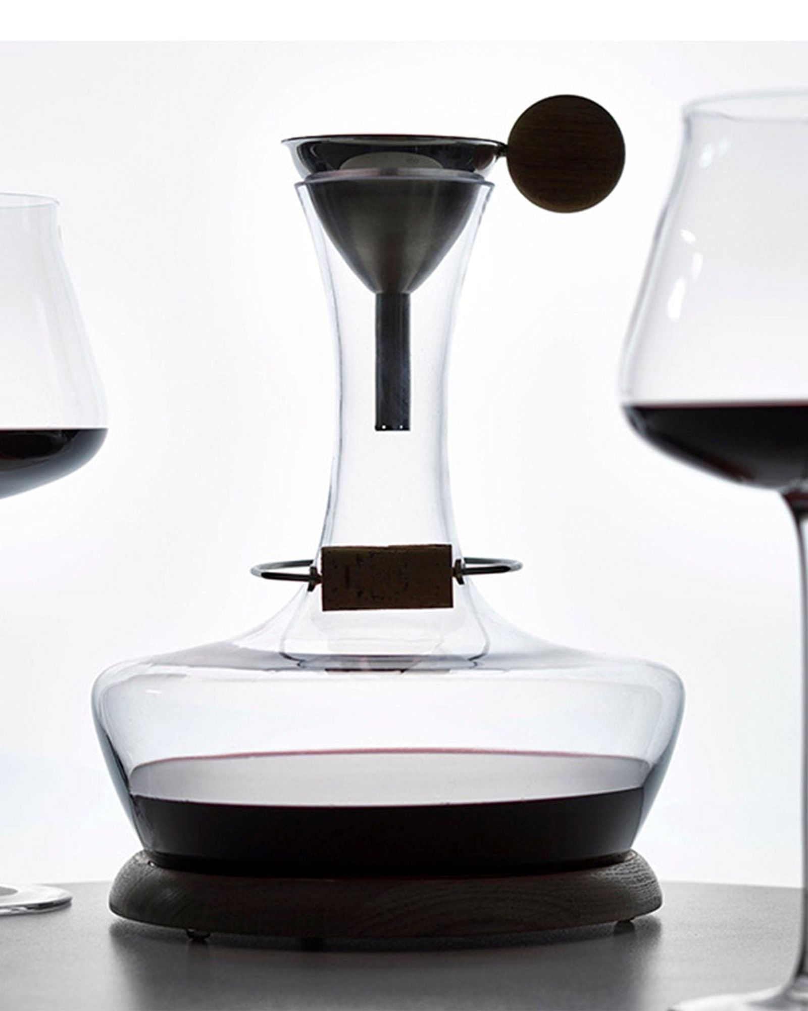 تتضمن مجموعة الدورق: دورق نبيذ منفوخ بالفم خالٍ من الرصاص من الكريستال، وقاعدة من خشب البلوط، وقمع، وحامل تجفيف، وحامل من الفلين