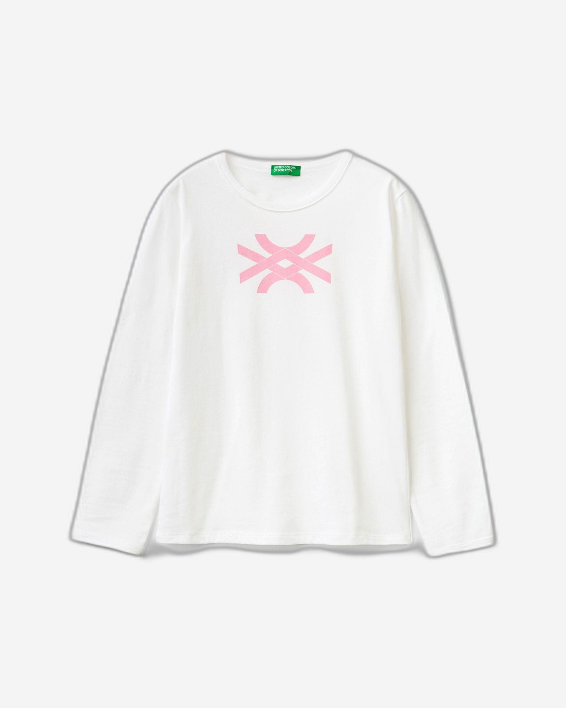 تيشيرت بياقة دائرية وأكمام طويلة من القطن الخالص. قصة عادية وشعار مطبوع على الأمام. تصميم بسيط ومريح، مثالي للاستخدام اليومي.