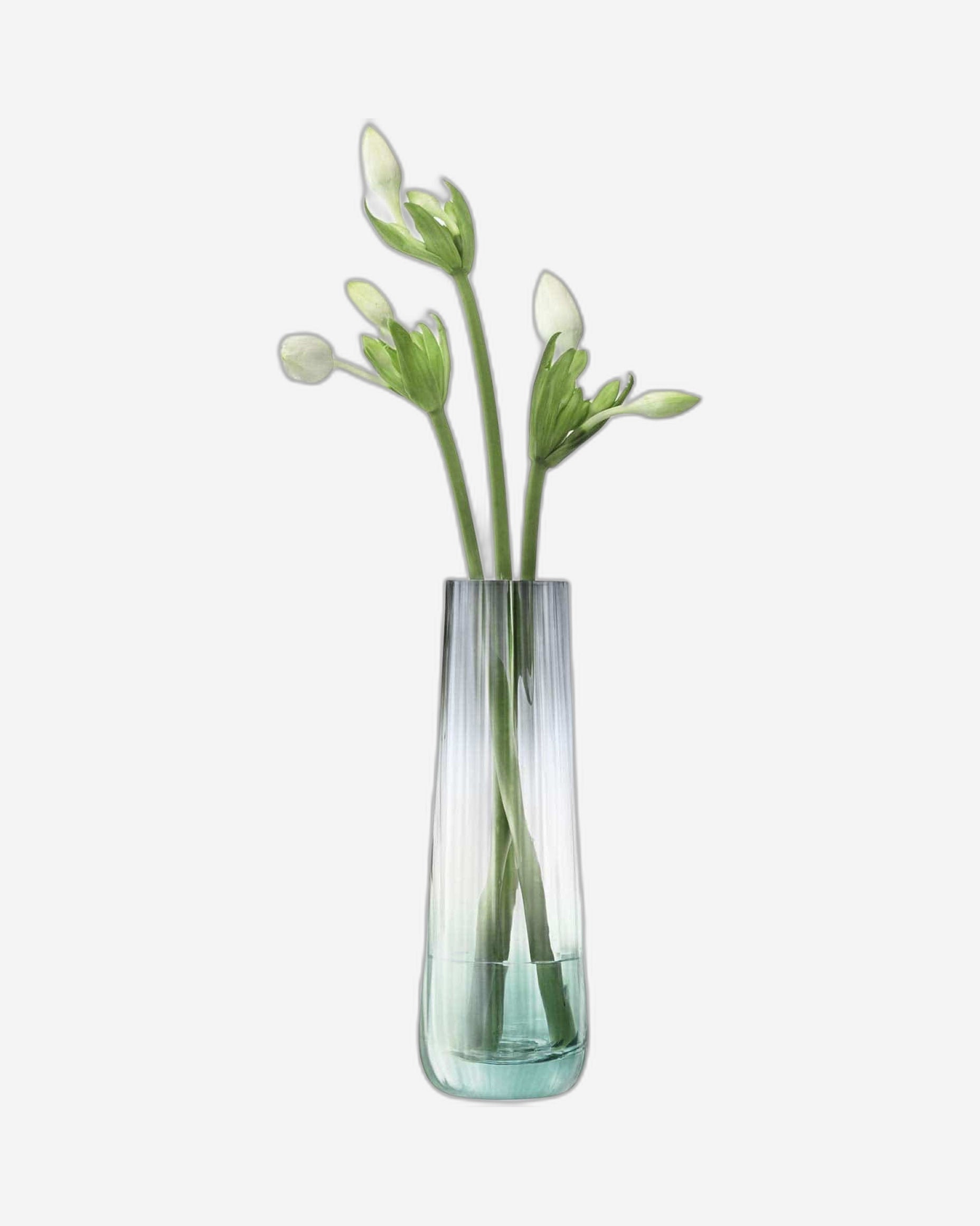 مزهرية منفوخة بالفم ذات نسيج مضلع، مطلية يدويًا بواسطة حرفيين مهرة مع بريق أخضر ورمادي. تنتشر الألوان الشفافة نحو مركز كل قطعة على شكل دمعة.
