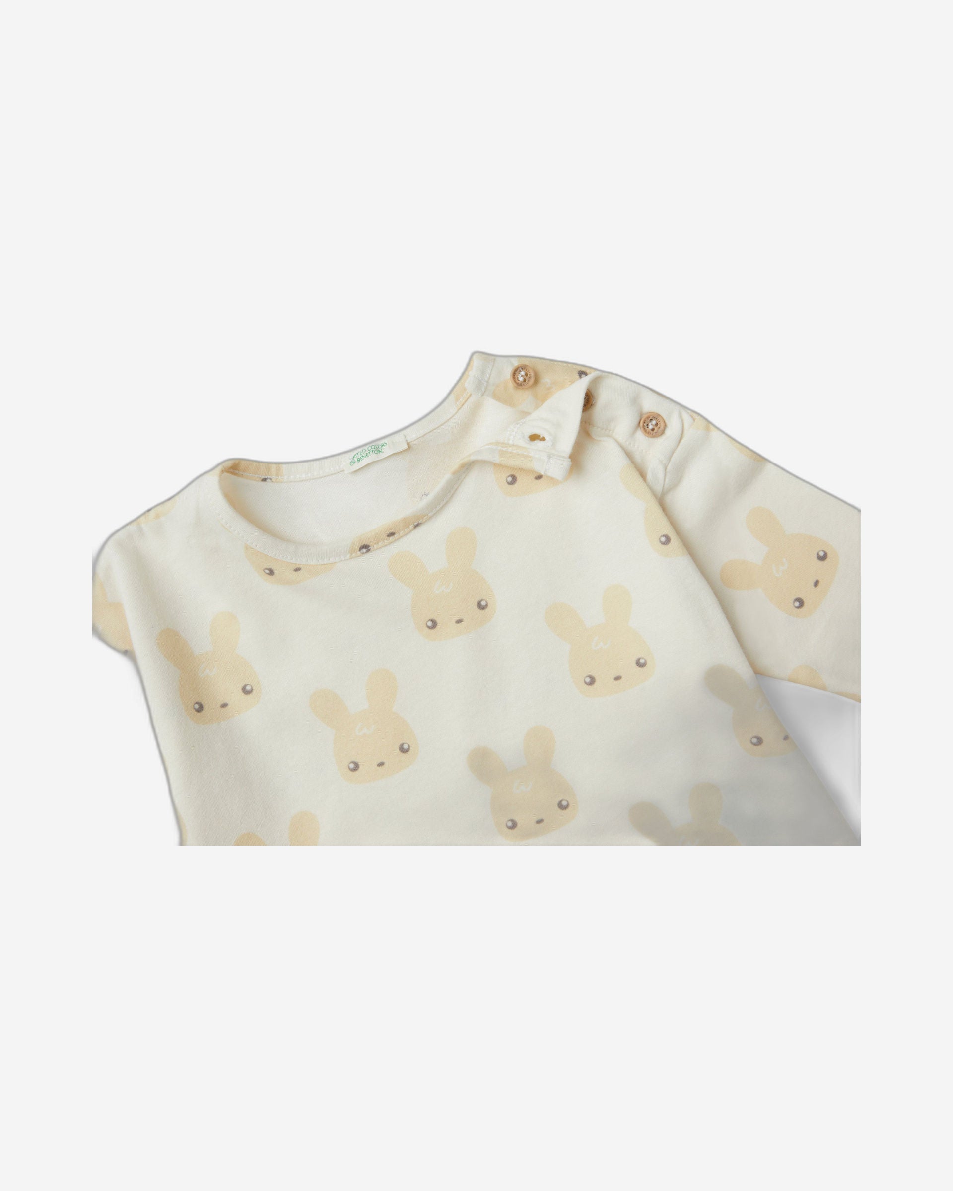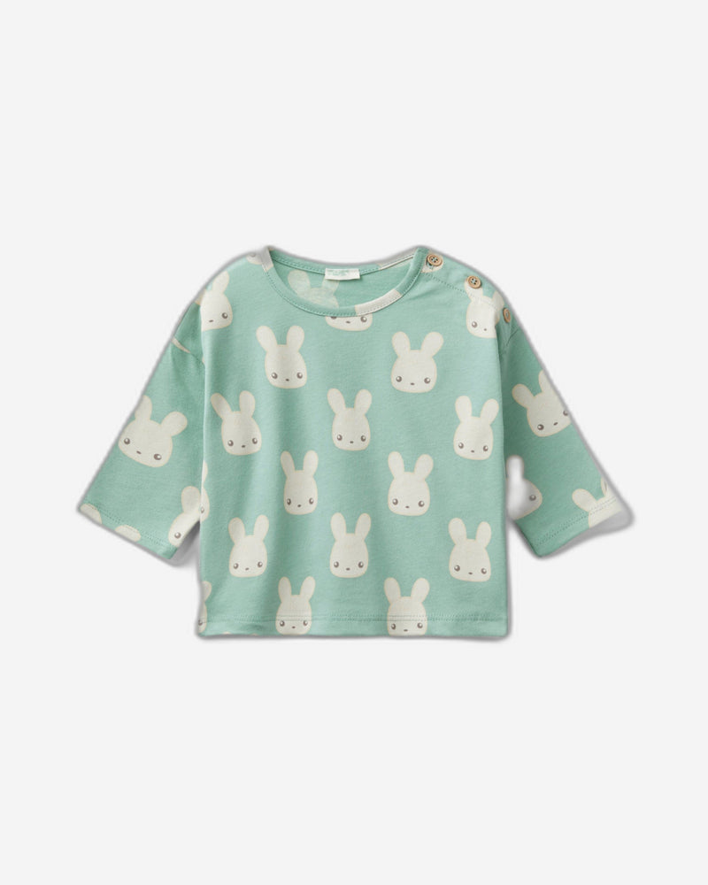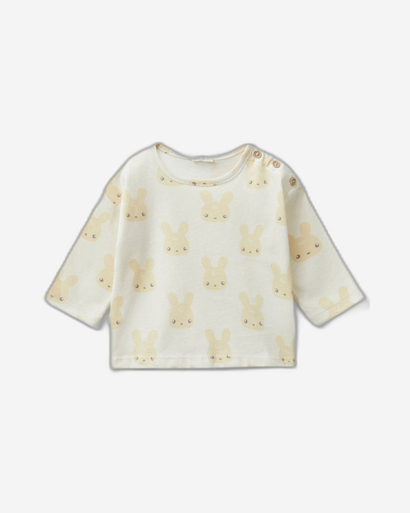 تيشيرت بأكمام طويلة من القطن الخالص بملمس دافئ، مزين بطبعة أرانب. تصميمه مربع، وياقة دائرية، وفتحة عملية بأزرار خشبية على الكتف الأيسر. ناعم ومريح، ولطيف على البشرة.