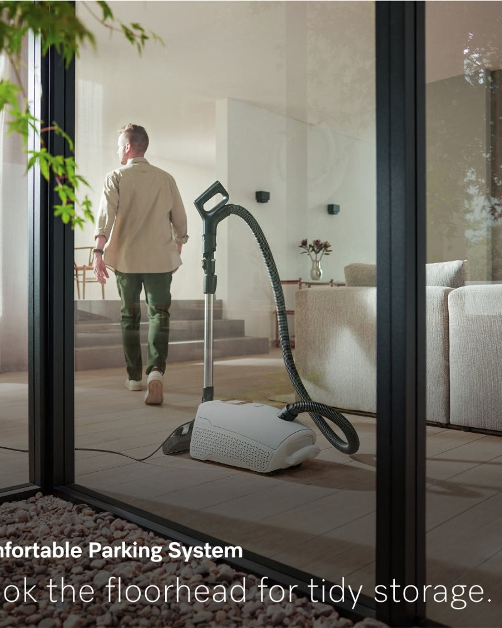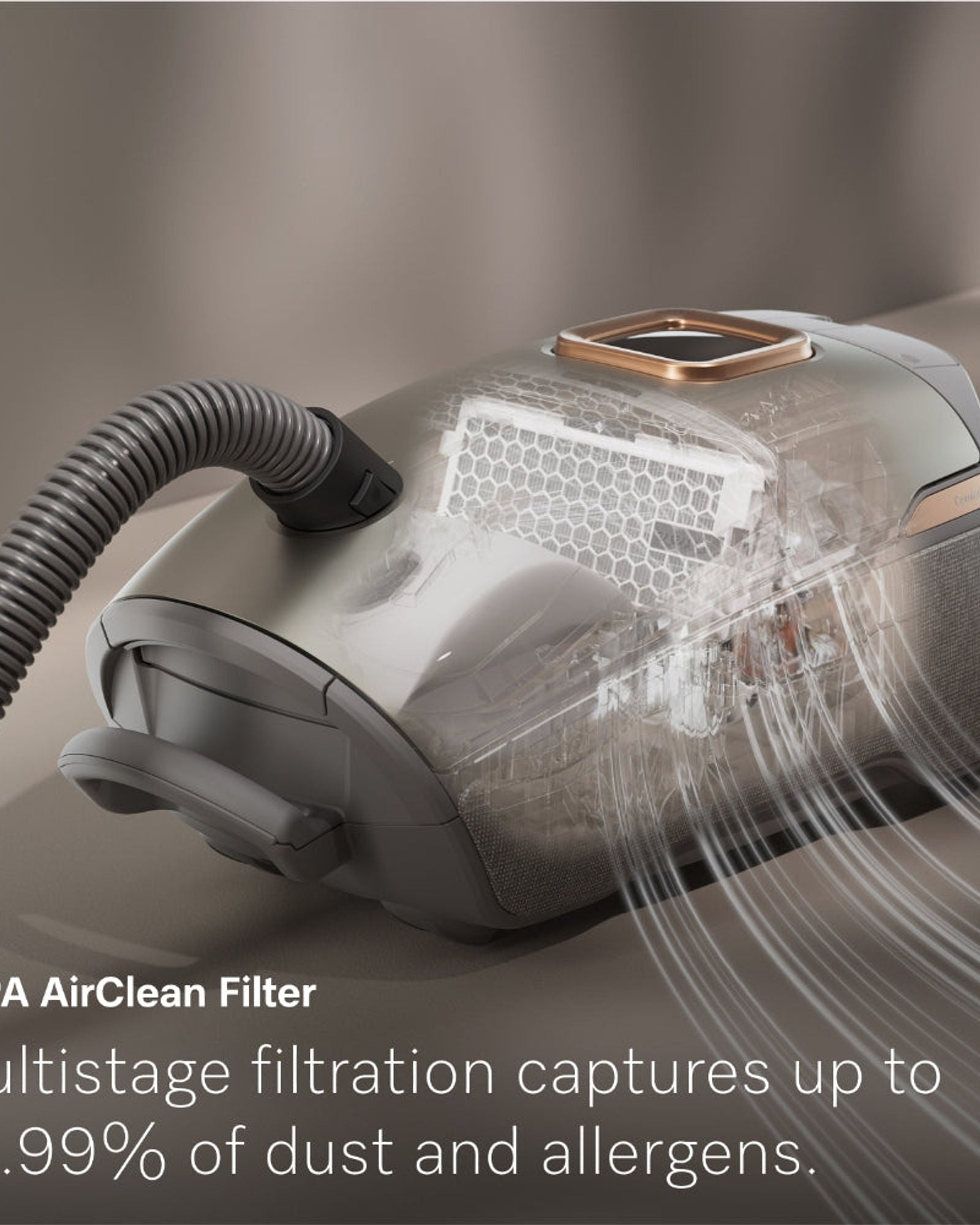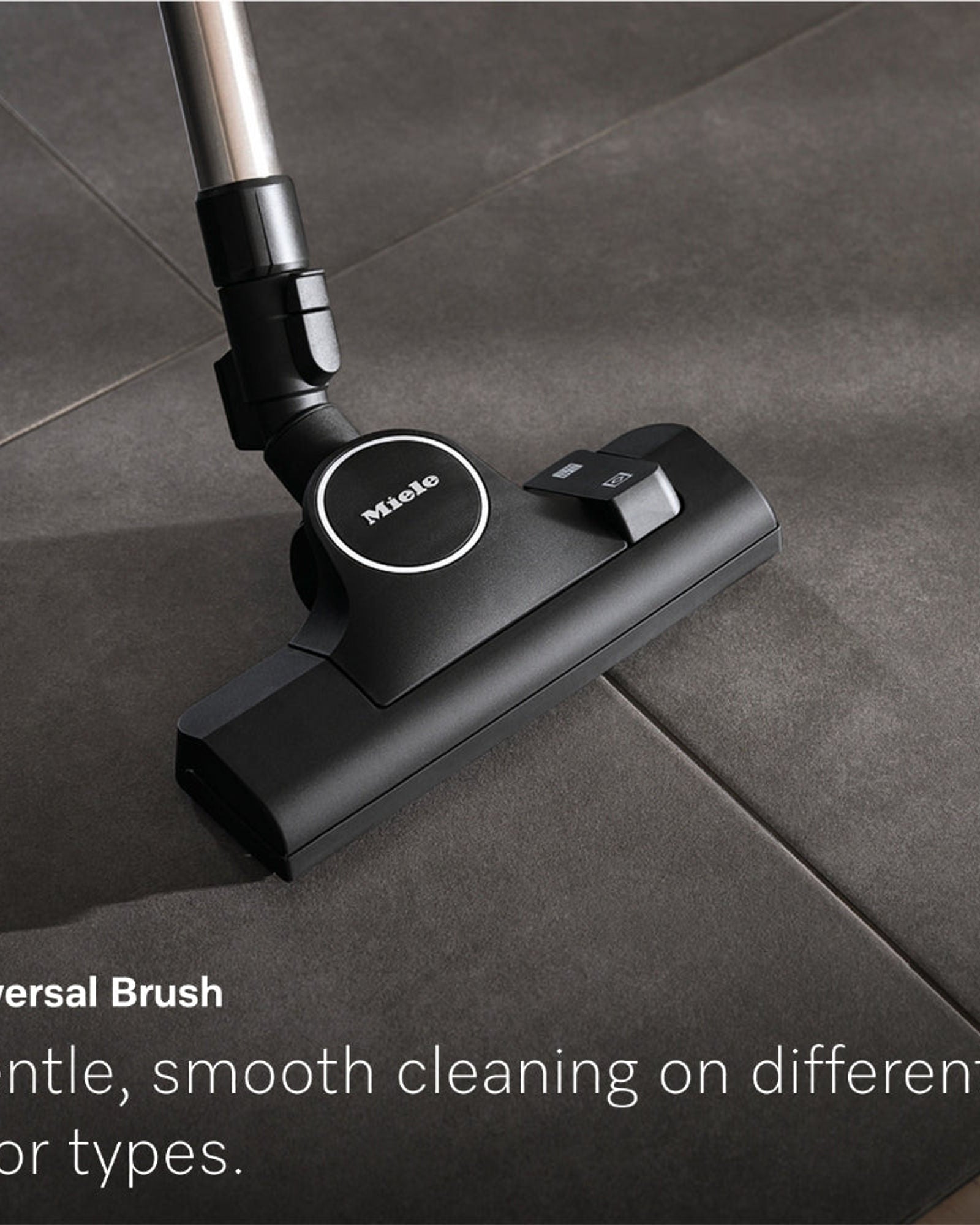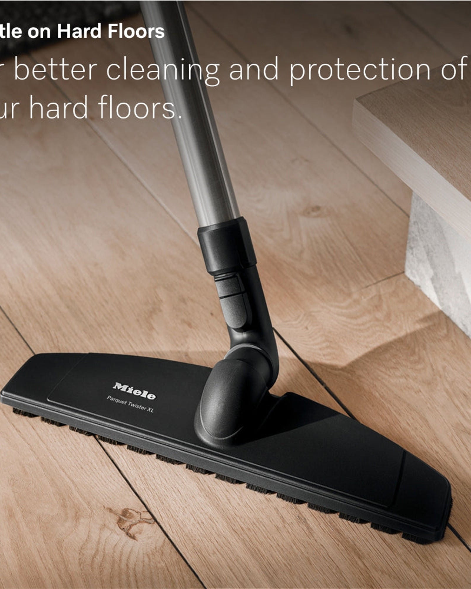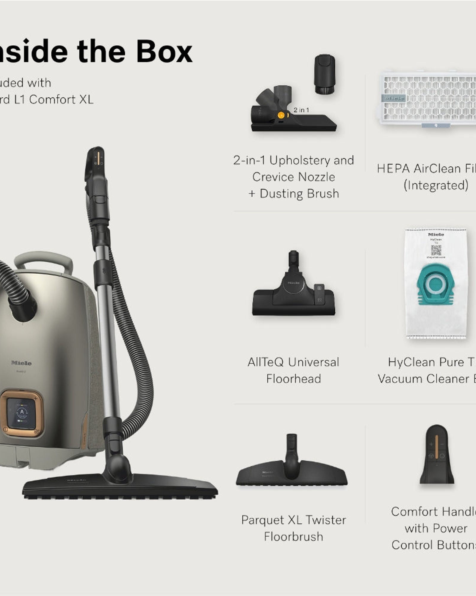 مكنسة كهربائية أسطوانية مزودة بكيس من Miele Guard L1 Comfort XL بمقبض مريح، ورؤوس أرضية AllTeQ وParquet Twister XL، وشاشة LCD، بلون لؤلؤي من التيتانيوم