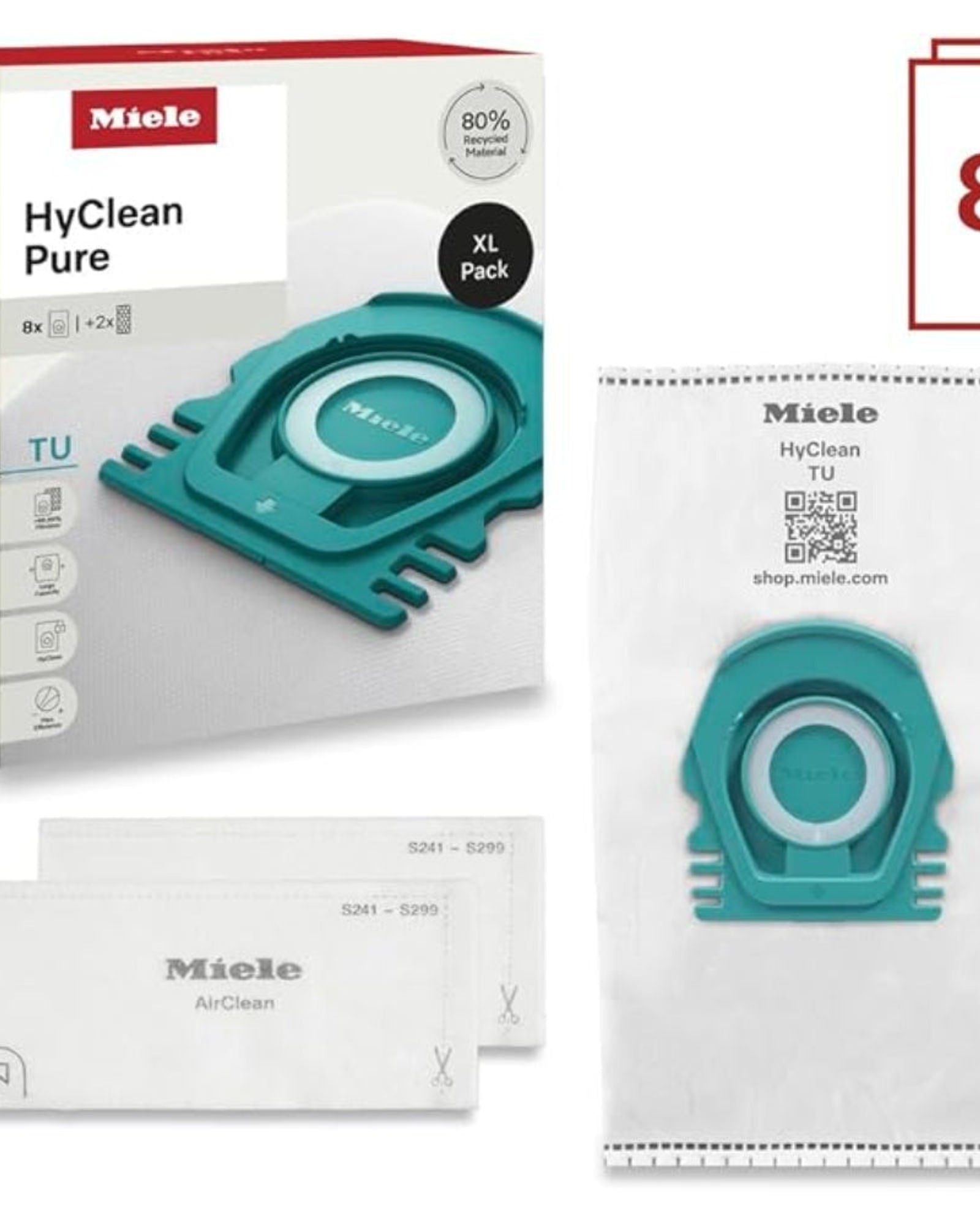 أكياس غبار Miele HyClean Pure TU للمكنسة الكهربائية لجميع طرازات Miele Guard L1 وGuard S1، عبوة XL مكونة من 8 أكياس غبار و2 فلتر عادم AirClean