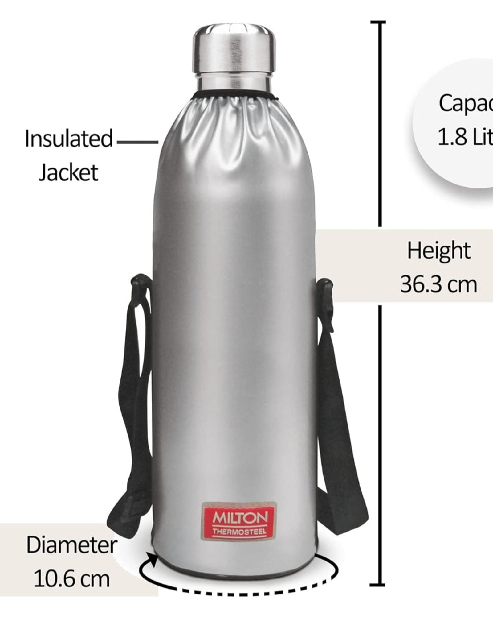 زجاجة مياه ميلتون معزولة بتفريغ الهواء سعة 1800 مل، مصنوعة من الفولاذ المقاوم للصدأ 18/8، تحافظ على المشروبات ساخنة وباردة لمدة 24 ساعة، ترمس مزدوج الجدار مع طلاء نحاسي داخلي - ديو ديلوكس - فضي