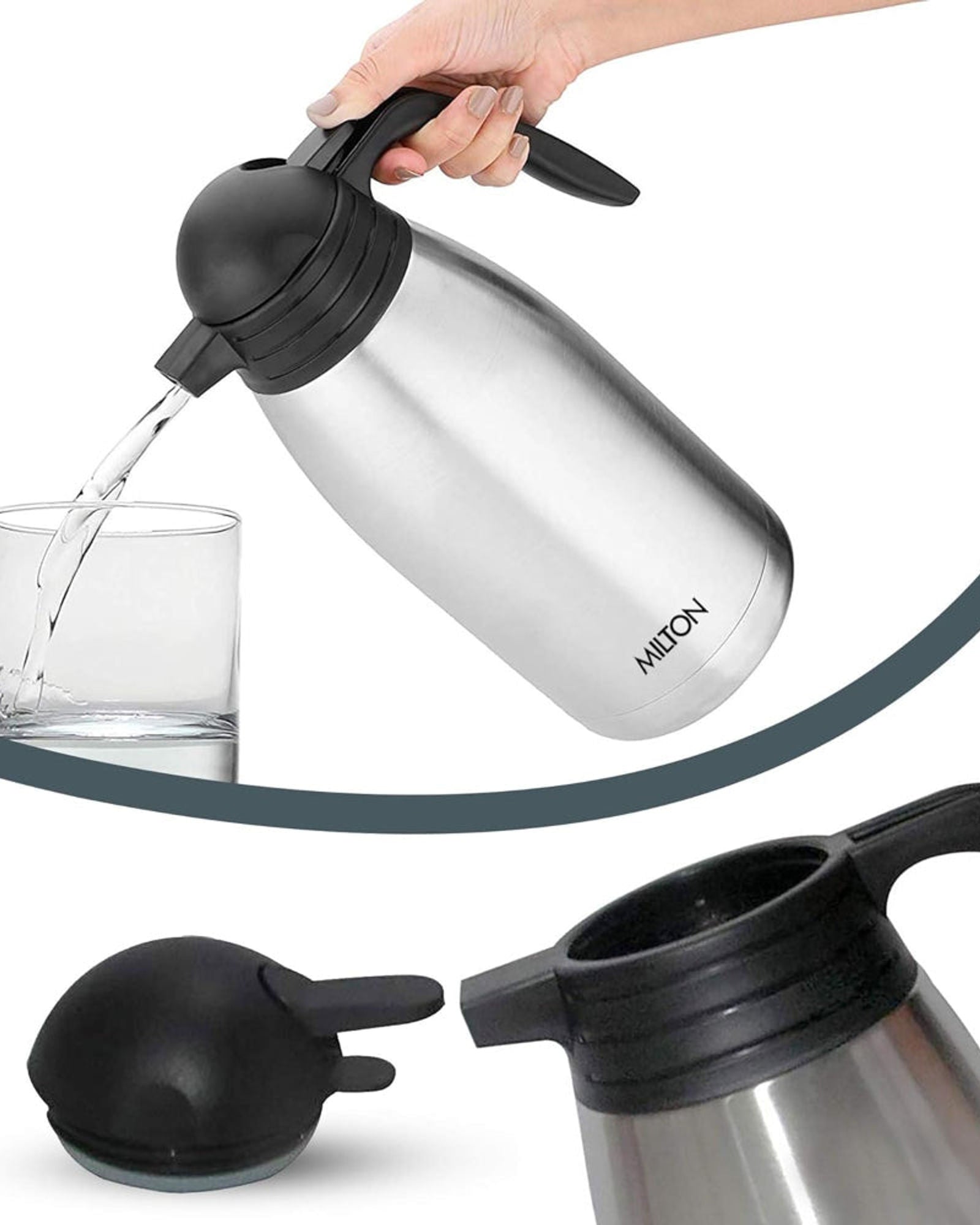 إبريق شاي/قهوة ميلتون سعة 2000 مل معزول بتفريغ الهواء، مزود بغطاء ضغط، يحافظ على المشروبات ساخنة أو باردة لمدة 24 ساعة، مصنوع من الفولاذ المقاوم للصدأ 18/8، قارورة مزدوجة الجدران مطلية بالنحاس من الداخل - كلاسيكي - فضي