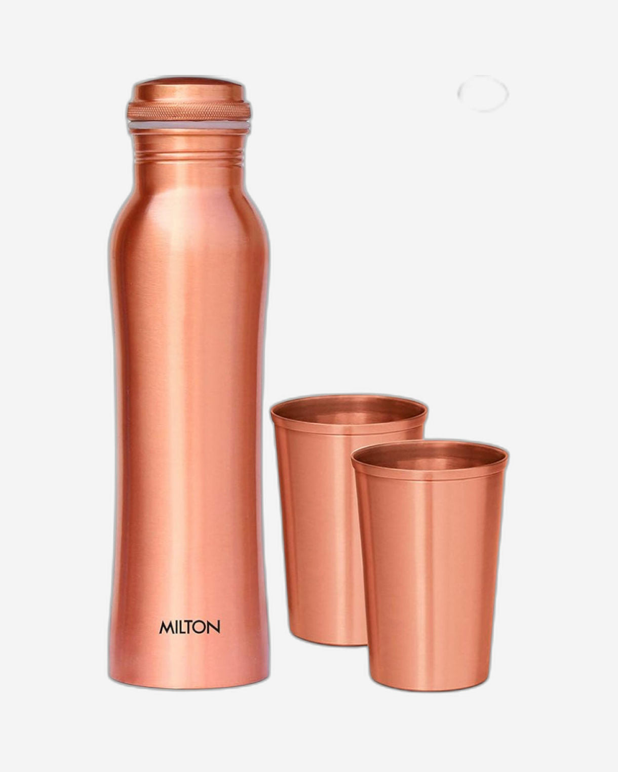 مجموعة هدايا ميلتون كوبرس: زجاجة واحدة سعة 950 مل مع كوبين، مصنوعة من النحاس النقي 100%، خالية من مادة BPA، مانعة للتسرب، زجاجة مكتبية، تعزز المناعة، تدعم صحة الجهاز الهضمي والكبد، مستوحاة من الطب الأيورفيدي.