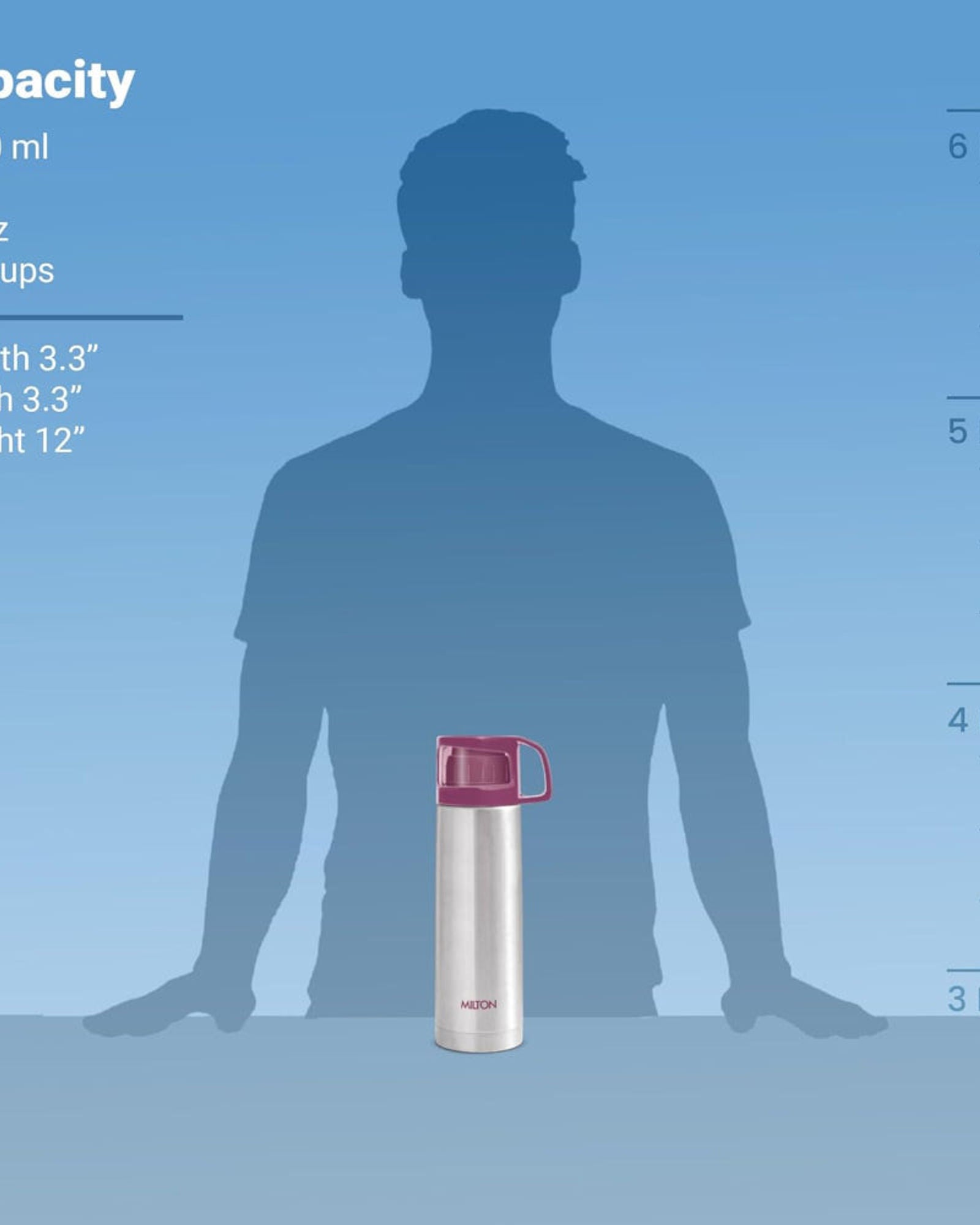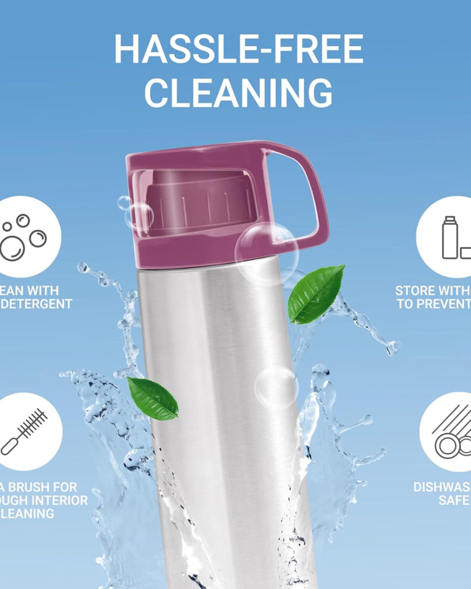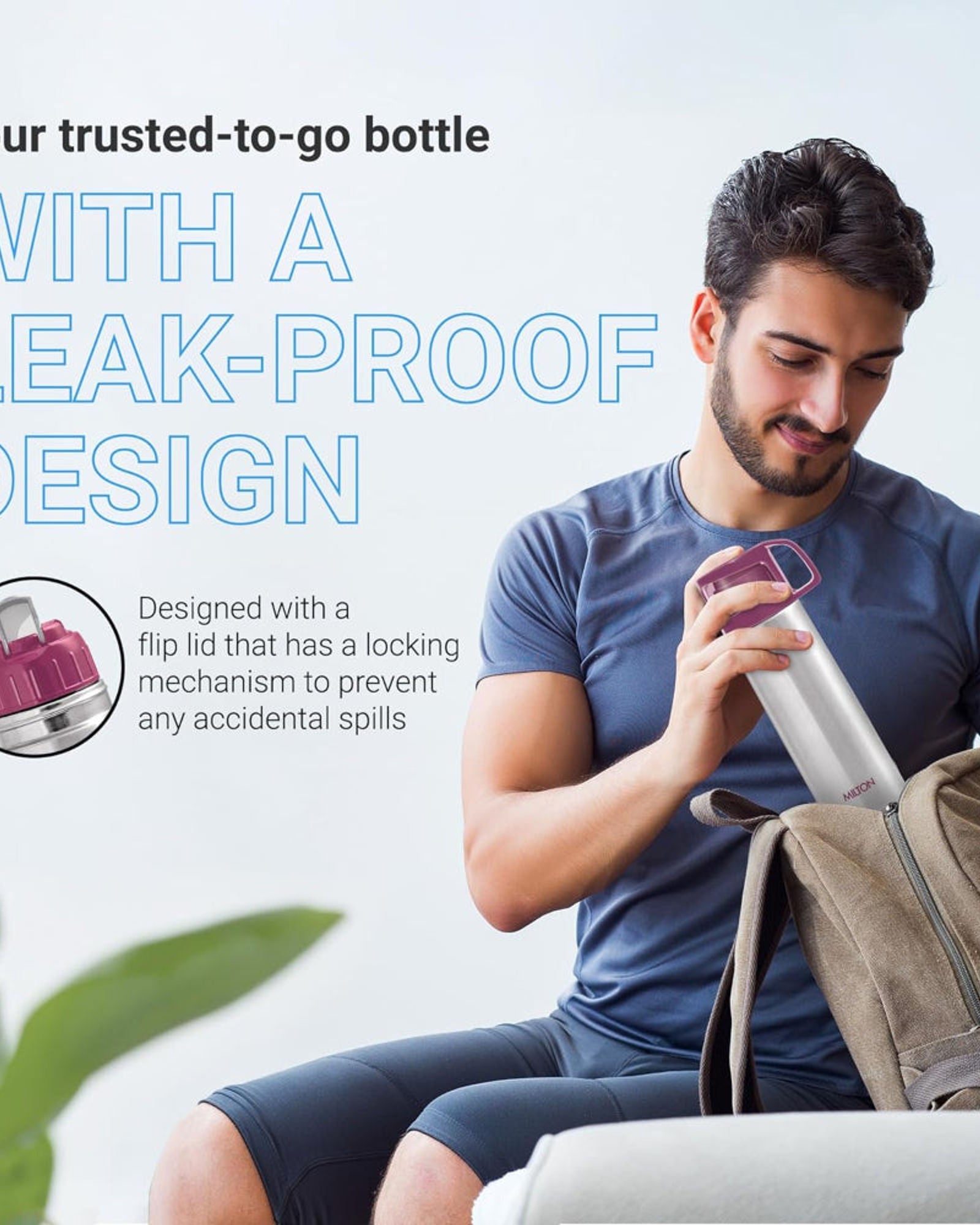 تتميز الزجاجة بغطاء بلاستيكي شفاف يُستخدم ككوب للشرب ، وغطاء داخلي مزود بزر ضغط لسهولة الصب دون انسكاب. تصميمها المانع للتسرب وحقيبة الحمل المرفقة المزودة بحزام يجعلانها مثالية للمكتب، والنادي الرياضي، والمنزل، والمطبخ، والسفر، والمشي لمسافات طويلة، والرحلات، والمغامرات في الهواء الطلق .