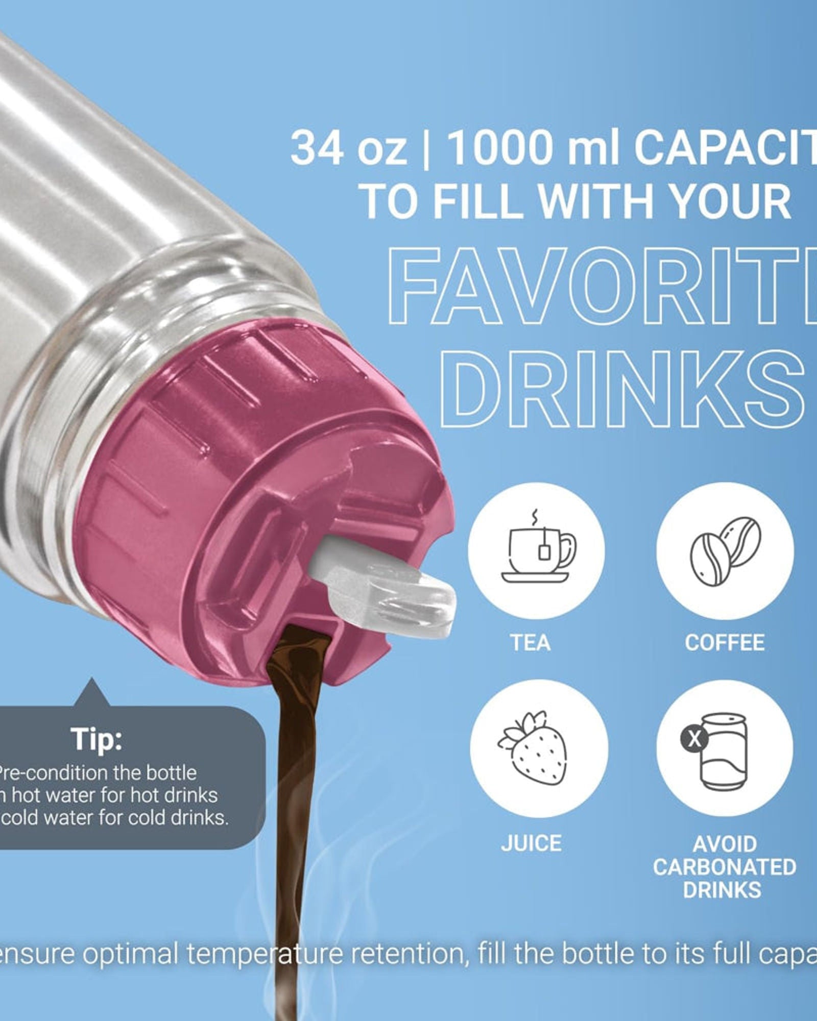 - نصيحة للاستخدام: قم بتسخينه مسبقاً بالماء الساخن للمشروبات الساخنة وبالماء البارد للمشروبات الباردة.