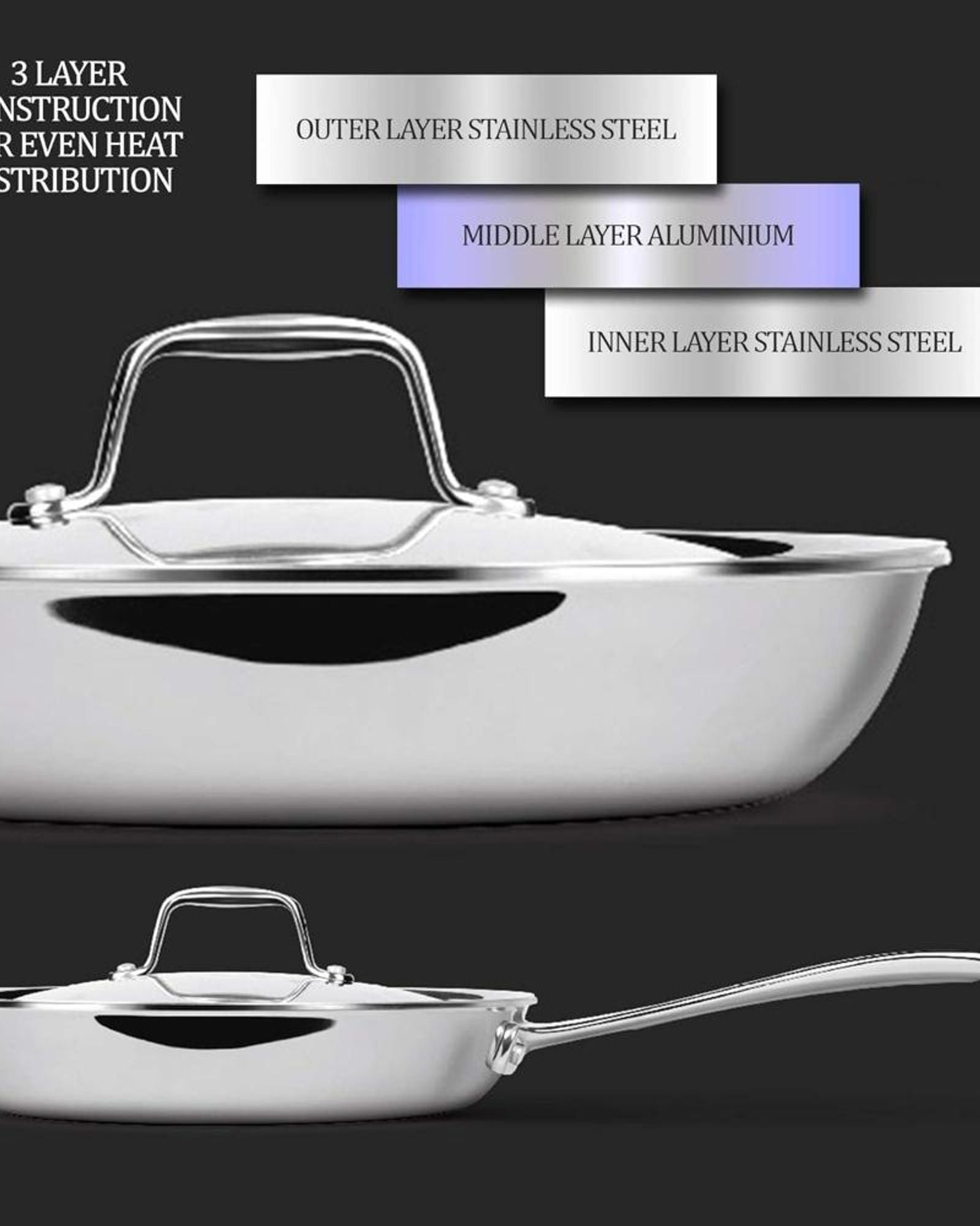 * تصميم ثلاثي: فولاذ مقاوم للصدأ 18/8 صالح للطعام من أجل طهي آمن وصحي، مصمم ليدوم طويلاً.