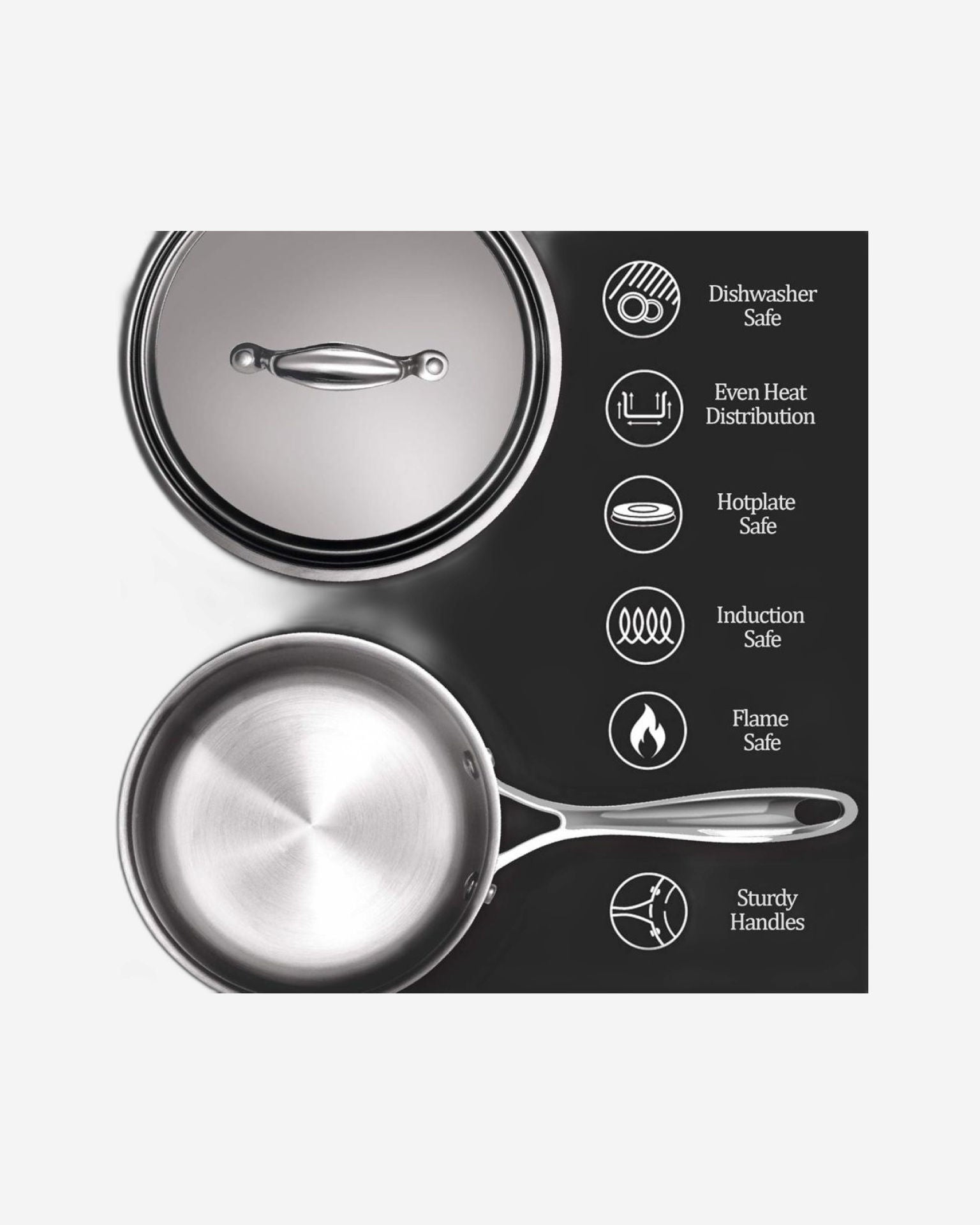 مع أواني الطهي المصنوعة من الفولاذ المقاوم للصدأ ثلاثي الطبقات، احصل على الجمال والأداء مع تلبية احتياجاتك الطهوية. اطهِ ما لذ وطاب مع هذه التقنية التي تسهل توزيع الحرارة بالتساوي. سهولة الاستخدام والصيانة مع هذه المجموعة المقاومة للبقع والالتصاق. مقبض زعنفة الهواء في قدر الصلصة يجعل الرفع والصب والطهي مريحًا. يمكنك استخدامه لغلي وتسخين وإعادة تسخين مجموعة متنوعة من الأطعمة. يساعد استخدام الغطاء على الاحتفاظ بالحرارة في القدر وبالتالي تسريع عملية الطهي بالتساوي. اطبخ بشكل أسرع وأكثر صحة وسعادة في هذه القطعة الفنية الجميلة. تتميز مجموعة أواني الطهي بتصميمها الجمالي وبالتالي يمكن أخذها مباشرة إلى طاولة العشاء من الموقد. متوافقة مع جميع مصادر التسخين مثل الحث والغاز واللوحة الساخنة، كما أنها سهلة التنظيف. مثالية لإعداد الشاي والقهوة والمشروبات الساخنة الأخرى إلى جانب غلي المعكرونة أو طهي الخضار على البخار أو صنع الصلصات أو طهي الحبوب فيها.