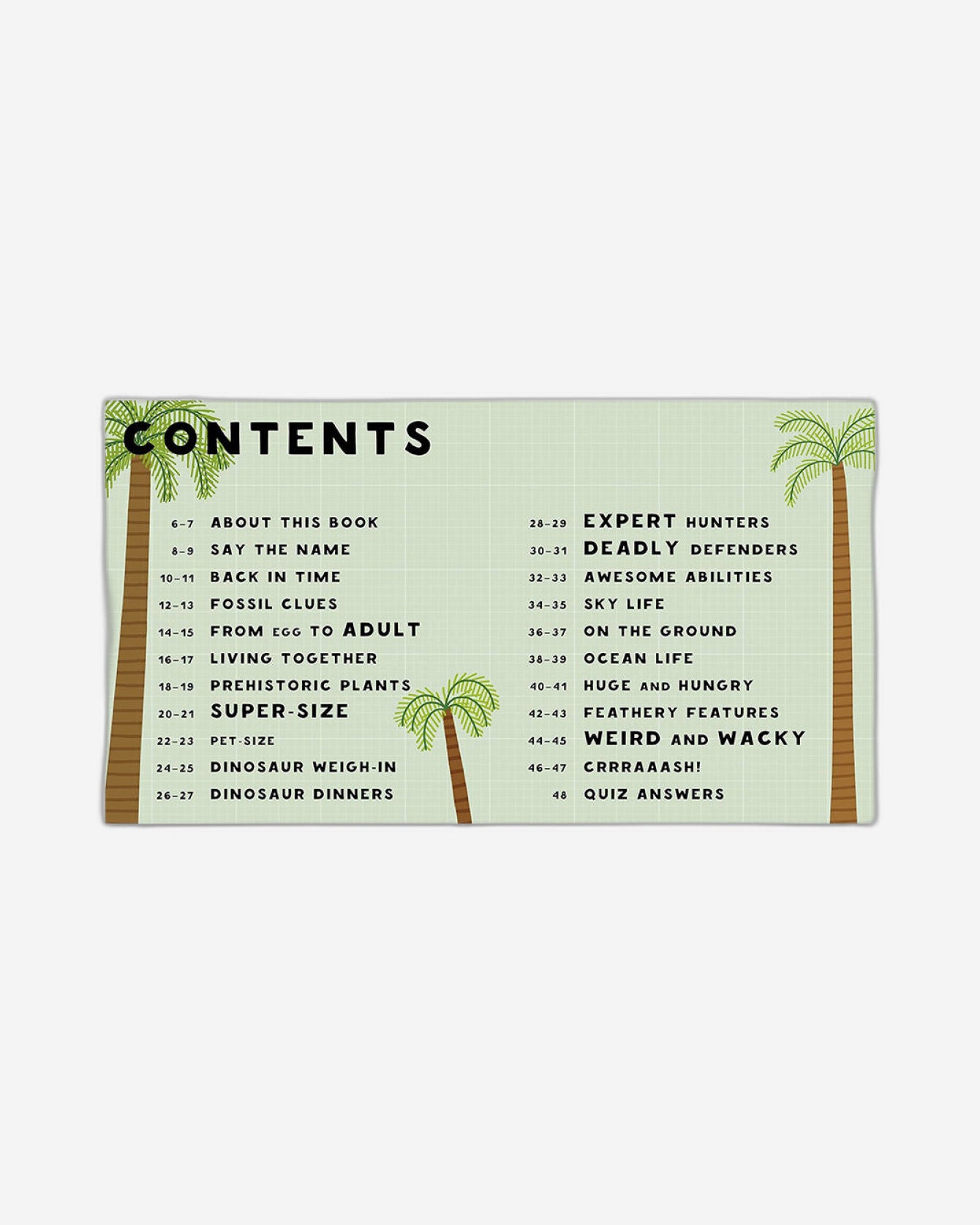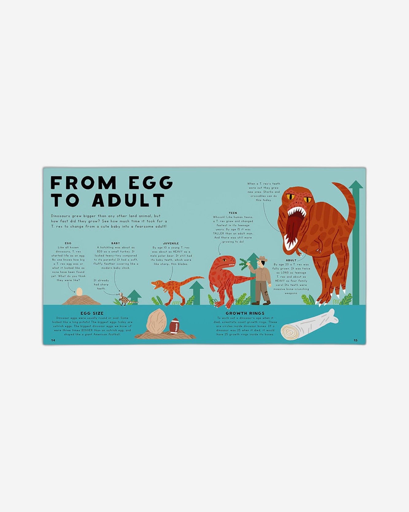 هذا الكتاب المصوّر النابض بالحياة، زاخر بالحقائق، يُسلّط الضوء على الديناصورات بشكلٍ غير مسبوق! هل تعلم أن الأرجنتينوصور كان يزن ما يقارب ١٢ فيلًا، وكان طوله كطول مبنى من خمسة طوابق؟ أو أن تي ريكس كان قادرًا على سحق سيارة بعضة واحدة؟ أو أن بعض بيض الديناصورات كان بحجم كرة القدم الأمريكية؟ هذا الكتاب المصوّر الشيق مليء بهذه الحقائق وغيرها الكثير. باستخدام مقارنات بصرية مُلفتة، وأسئلة اختبار، وحقائق مُختصرة، يُعلّم هذا الكتاب الأطفال من سن الخامسة فما فوق كل شيء عن مخلوقات ما قبل التاريخ المُفضّلة لديهم.