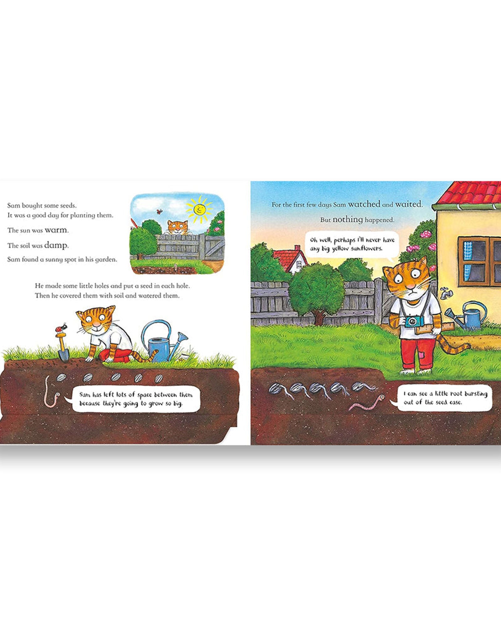 اكتشف متعة زراعة الأشياء في سلسلة كتب الطبيعة المصورة غير الخيالية هذه من أكسل شيفلر والصندوق الوطني. سام يعشق زهور عباد الشمس الصفراء الكبيرة، لذا عندما اقترح عليه صديقاه "وورم" و"ليدي بيرد" زراعة بذوره بنفسه، سرعان ما زرع بعض البذور في حديقته. انضم إلى سام وهو يشاهدها تنمو، مع لوحات مرحة ليرفعها ليرى ما يحدث تحت الأرض، ومفاجأة منبثقة لزهرة عباد شمس كبيرة. مع قصة لطيفة وحقائق بسيطة تشرح كيفية نمو النباتات، سيشجع الأطفال على الخروج واتباع النصائح المفيدة لزراعة زهور عباد الشمس الخاصة بهم.