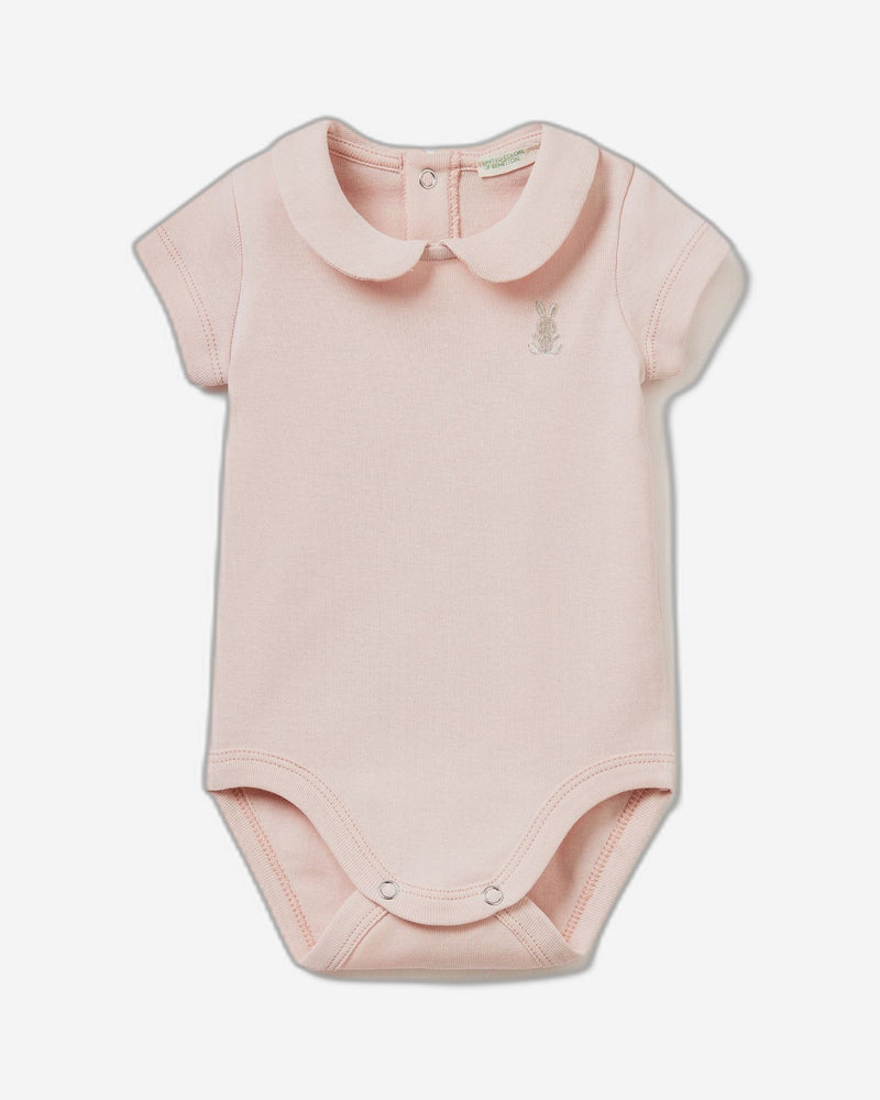بدلة من القطن العضوي الخالص المضلع. ياقة دائرية أنيقة وشعار أرنب مطرز على الصدر الأيسر. فتحة جزئية عملية في الظهر وبين الساقين بأزرار كبس. مريحة وأنيقة.