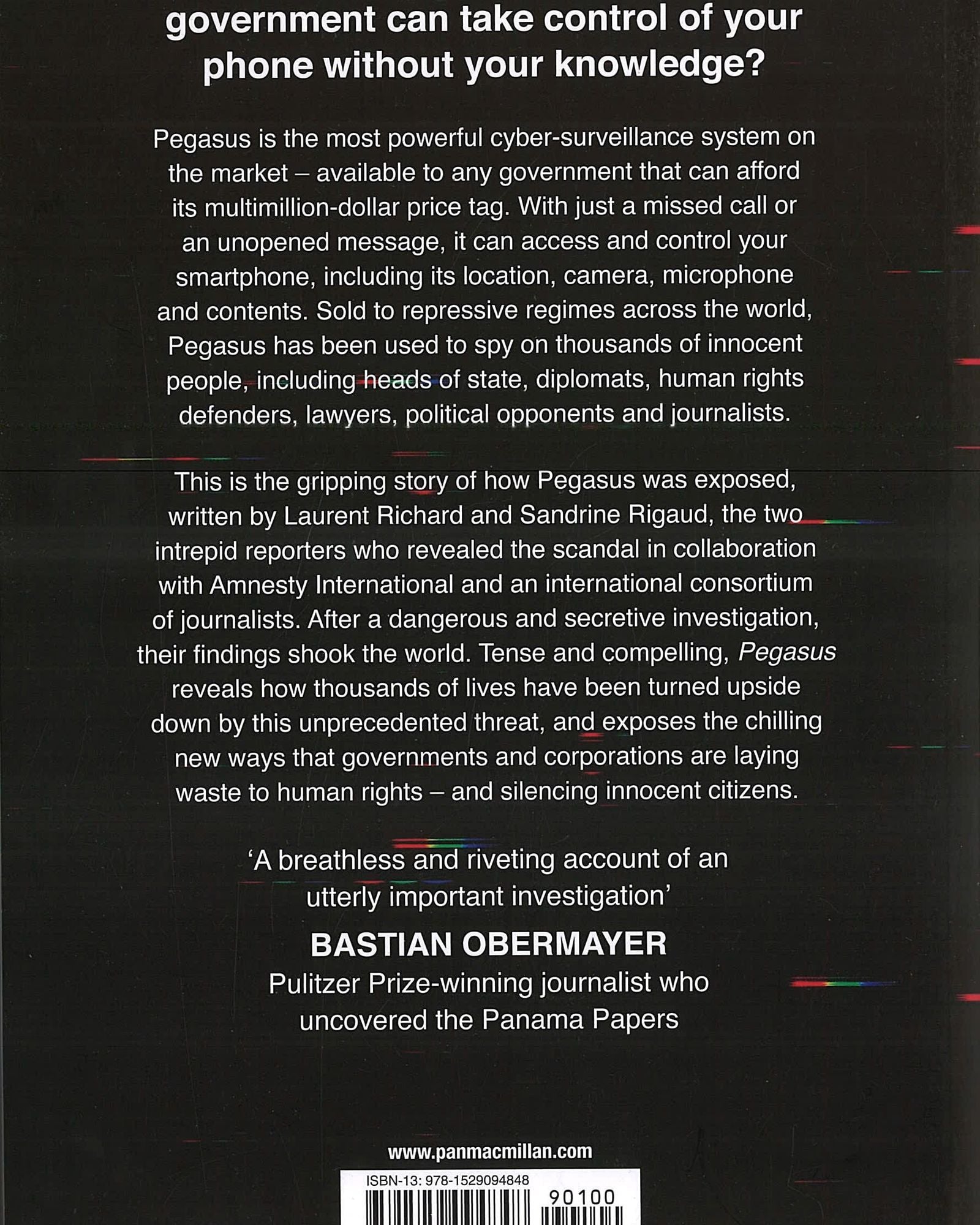 هذه هي القصة المشوقة لكيفية كشف بيغاسوس، كتبها لوران ريتشارد وساندرين ريغو، الصحفيان الجريئان اللذان كشفا الفضيحة بالتعاون مع اتحاد صحفيين دولي. تلقّيا قائمة مسربة تضم 50 ألف رقم هاتف محمول، لكنهما كانا بحاجة إلى إثبات تورط شركة NSO. بعد تحقيق خطير وسريّ شمل العالم، هزّت نتائجهما العالم. يكشف بيغاسوس، بأسلوبه المشوق والمثير، كيف انقلبت حياة آلاف الأشخاص رأسًا على عقب بسبب هذا التهديد غير المسبوق، ويكشف عن الأساليب الجديدة المروّعة التي تنتهك بها الحكومات والشركات حقوق الإنسان - وتُسكت المواطنين الأبرياء.