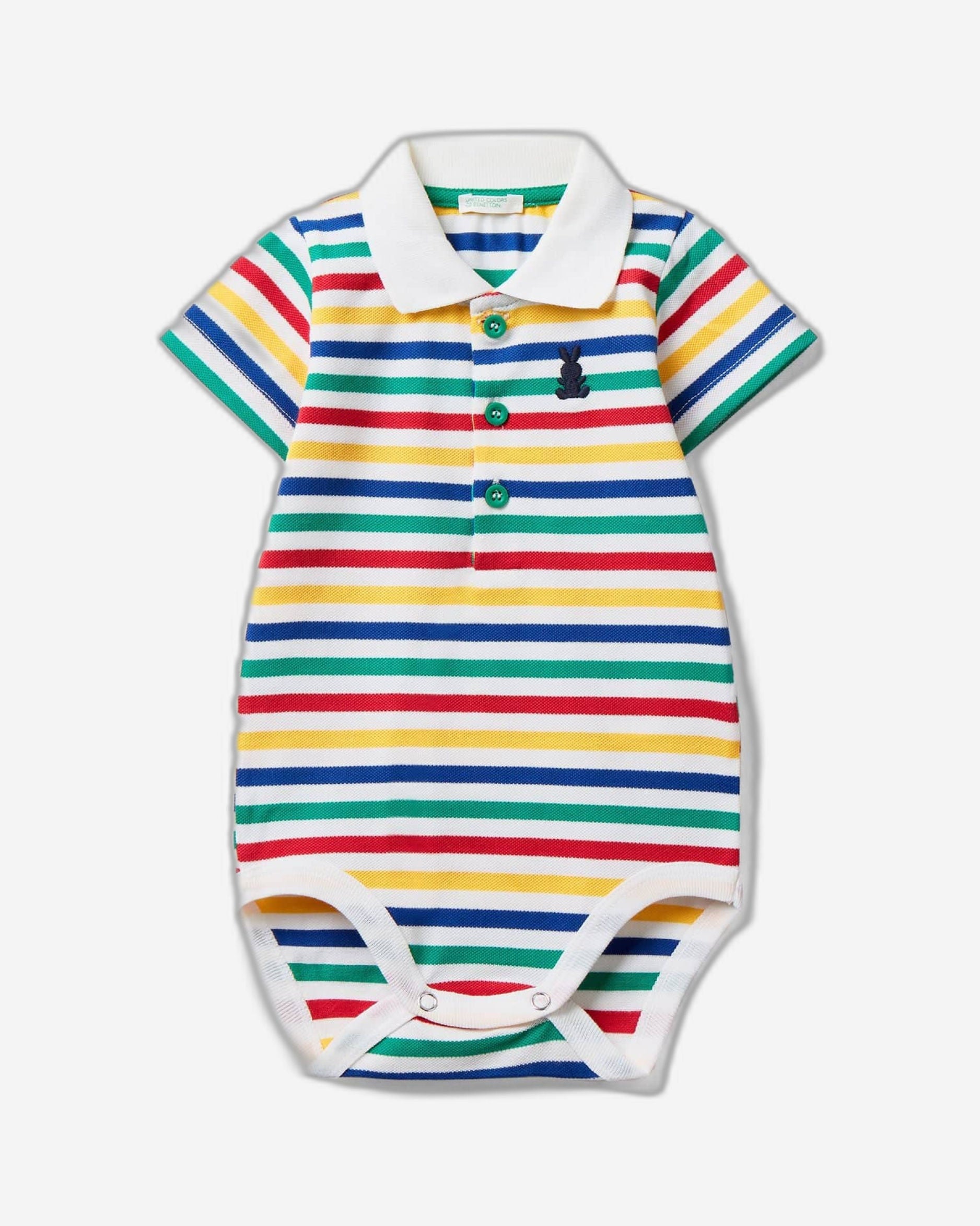 بودي سوت بولو بأكمام قصيرة من قطن بيكيه مطاطي مخطط مصبوغ بخيوط. تطريز أرنب على الصدر الأيسر، وياقة كلاسيكية بفتحة جزئية وأزرار كبس عند منطقة العانة. تصميم كاجوال بنسخة للأطفال.