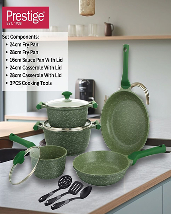 • طقم بريستيج إسينشالز مكون من 10 قطع، لون أزرق جرانيت، مصنوع من الألومنيوم المصبوب غير اللاصق