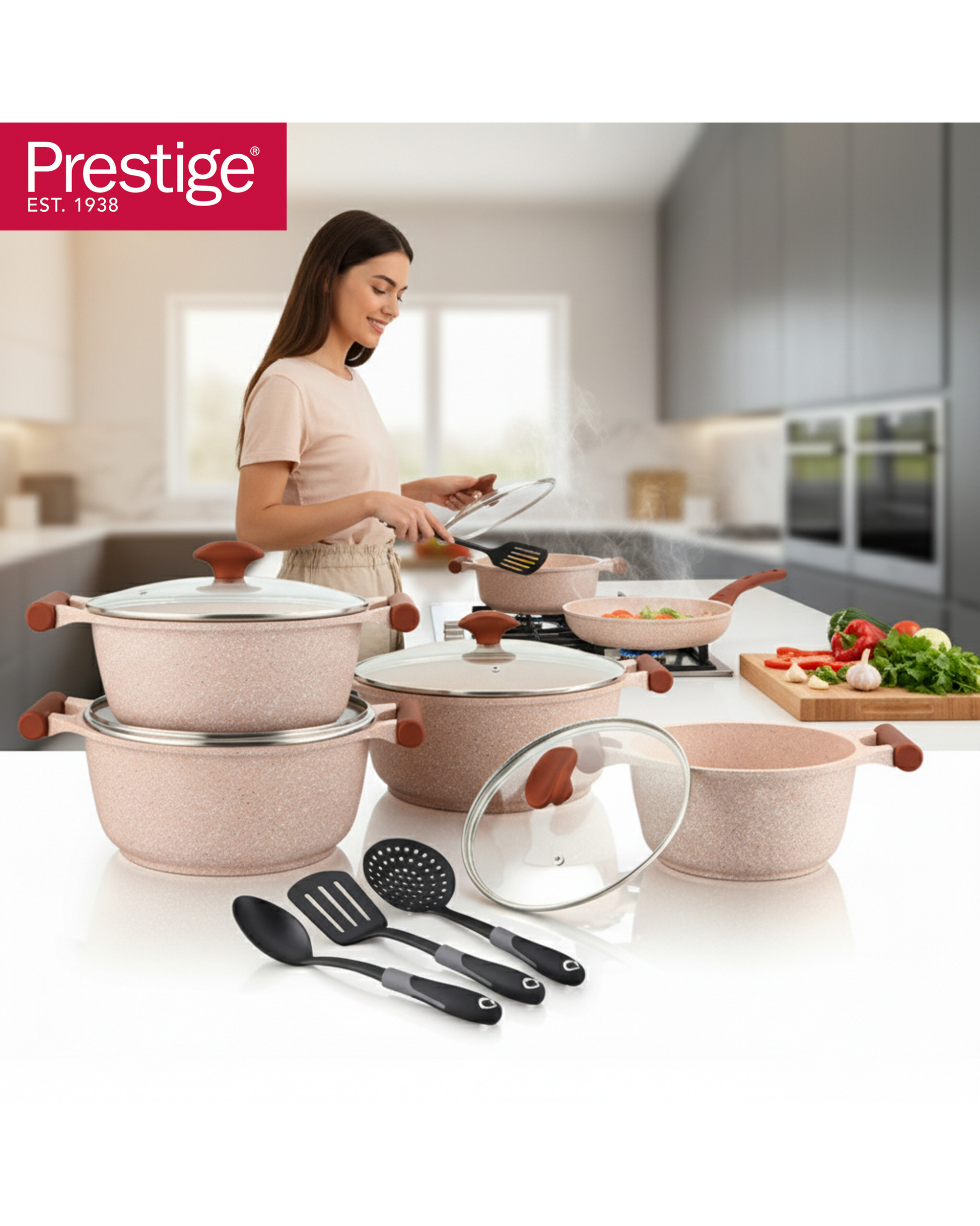 • طقم بريستيج إسينشالز مكون من 12 قطعة، لون جرانيت أخضر، مصنوع من الألومنيوم غير اللاصق