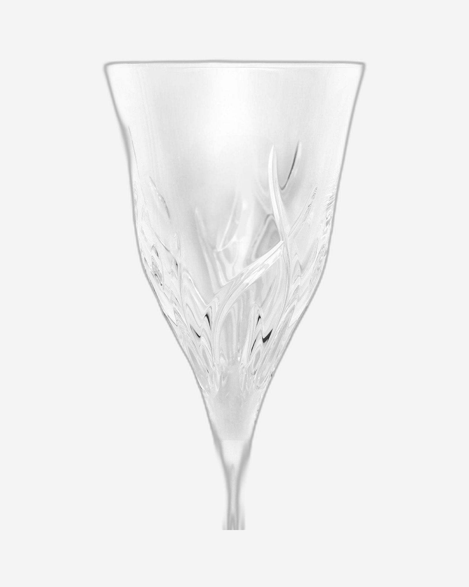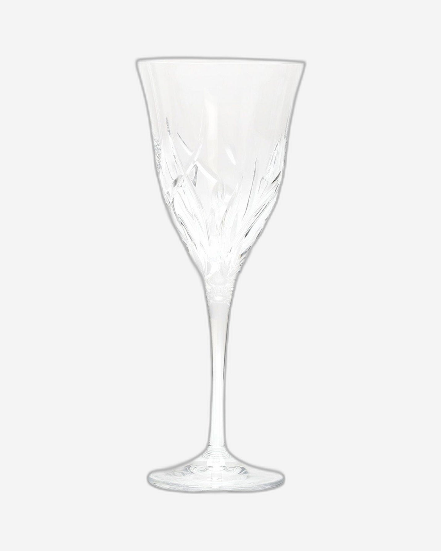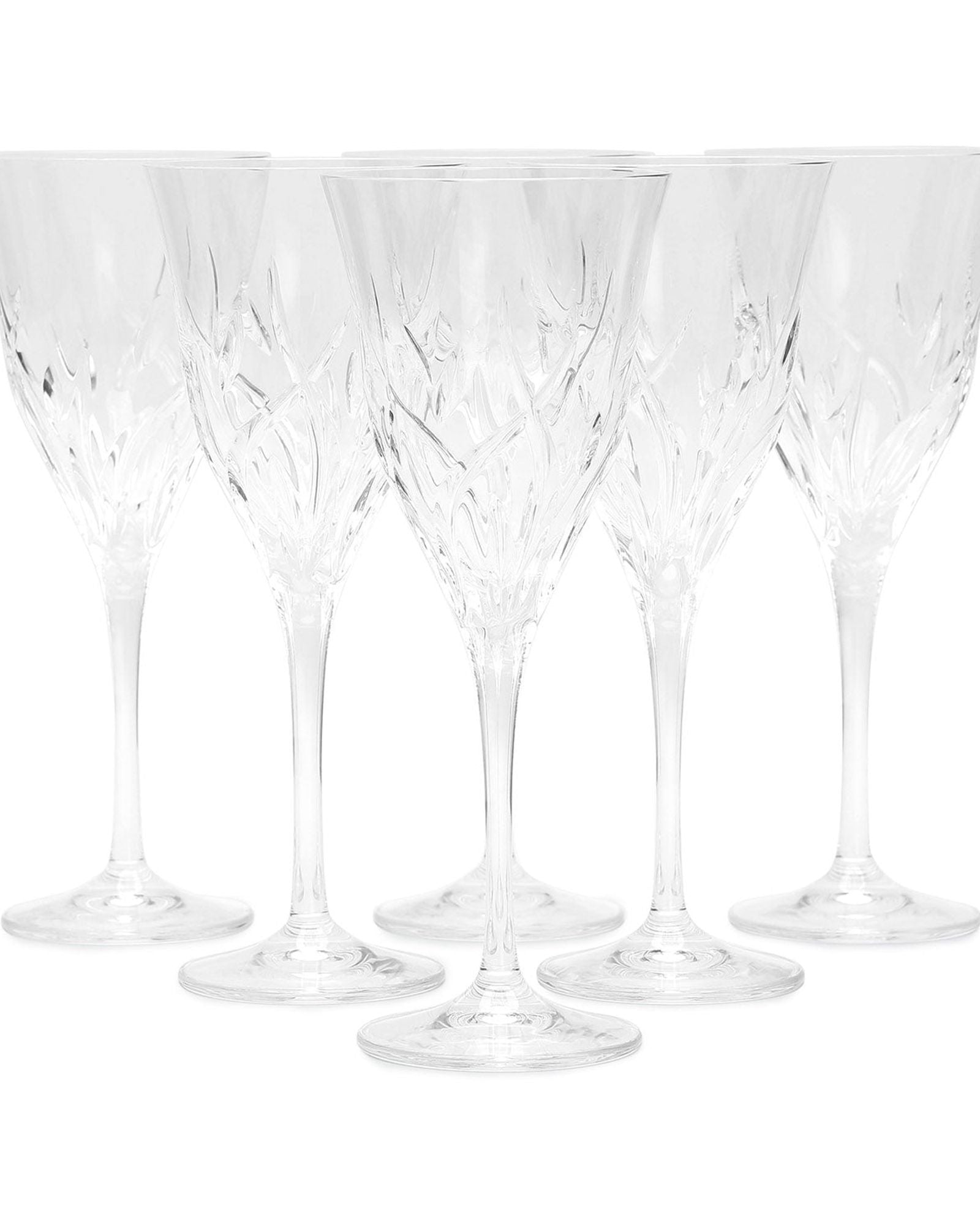 طقم من ٦ قطع من الزجاج المقطوع بتفاصيل مميزة - يتميز بنقش عميق أو دوار أو عمودي على الوعاء والساق لمظهر فاخر وجذاب. شكل كلاسيكي - كأس مع وعاء وساق متينة - مثالي للنبيذ أو الماء أو الكوكتيلات.