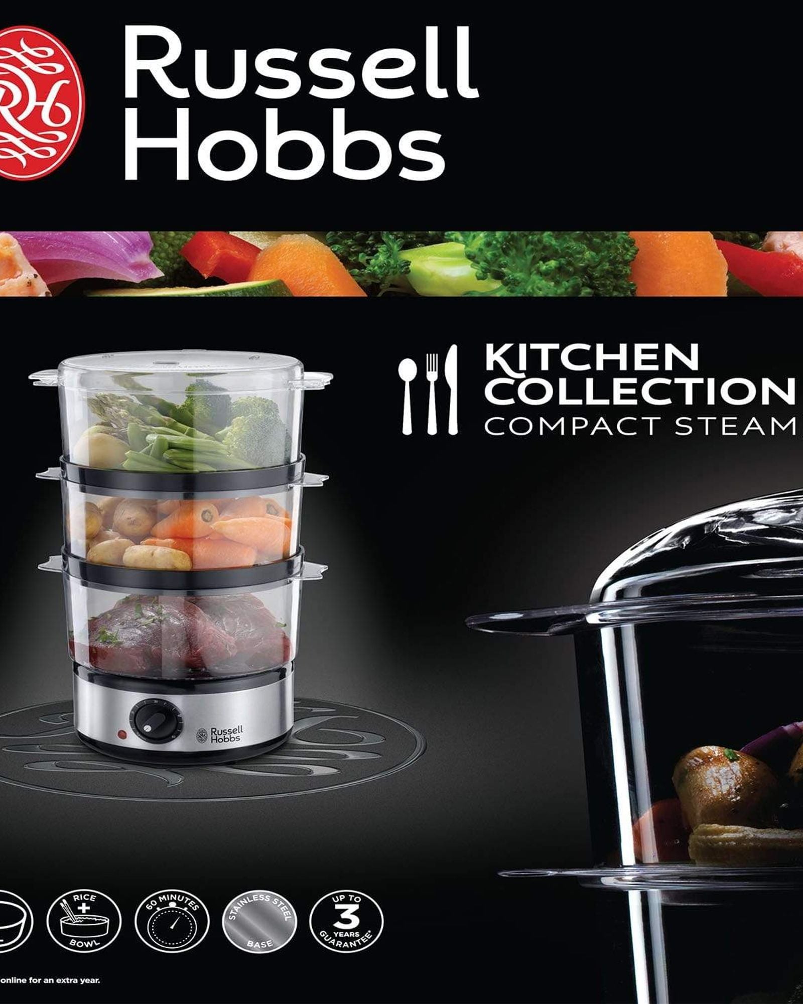 جهاز طهي بالبخار من راسل هوبز (14453) - 3 طبقات، سعة 7 لتر، 400 واط، مؤقت 60 دقيقة، مثالي لطهي طعام الأطفال والوجبات الصحية، قاعدة من الفولاذ المقاوم للصدأ - ضمان لمدة عام واحد