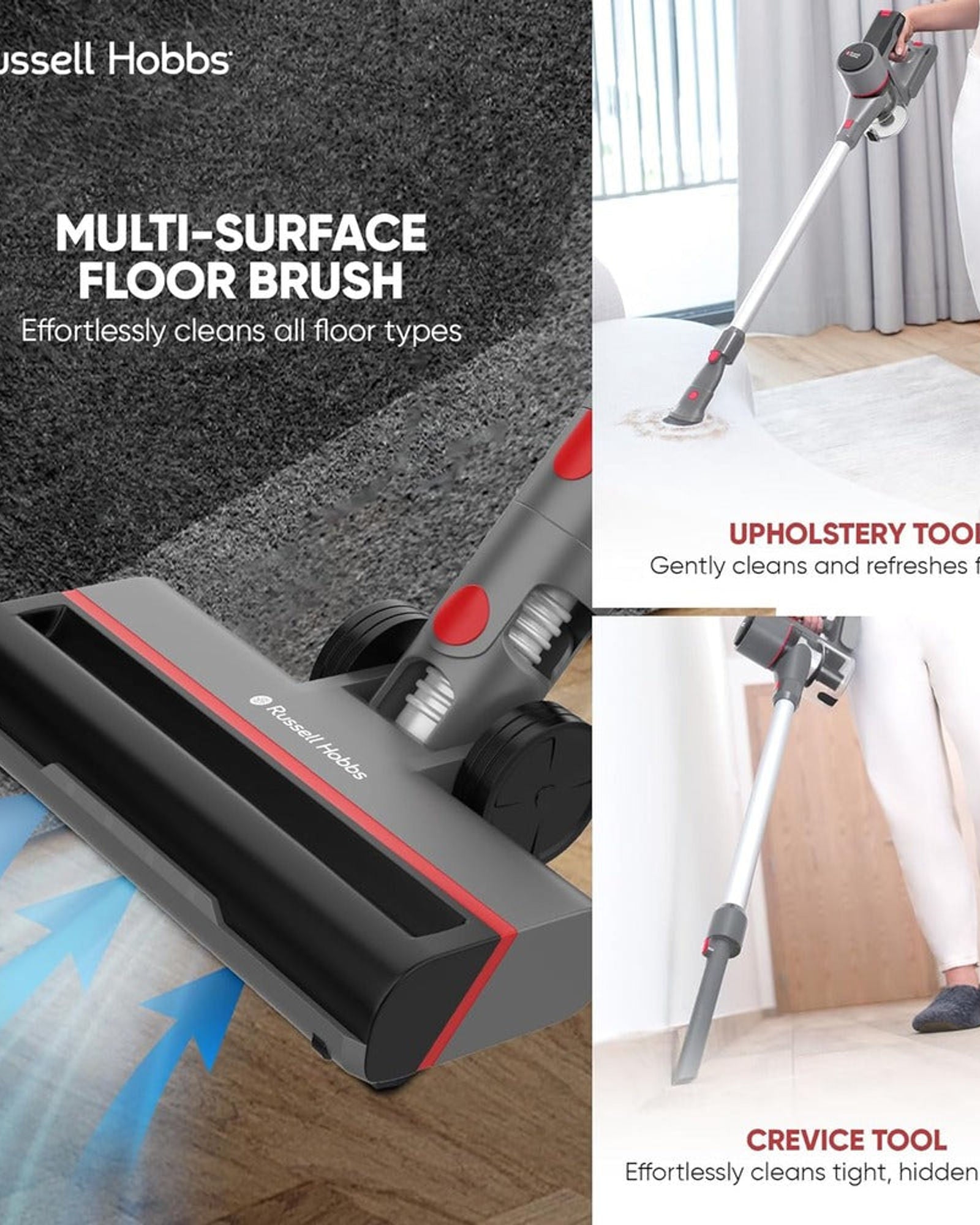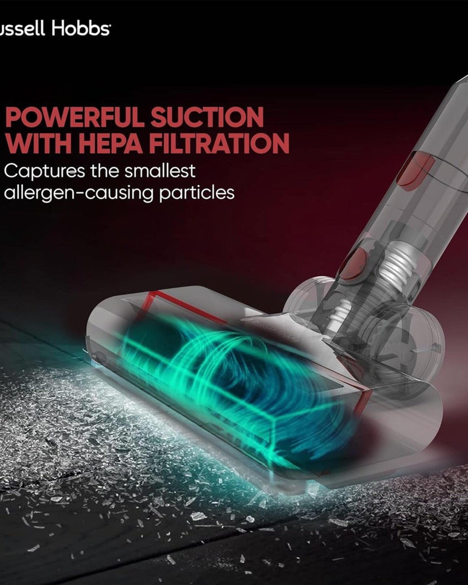مكنسة راسل هوبز سبيدستر V05 اللاسلكية، مزودة بفلتر هواء عالي الكفاءة (HEPA)، وتفريغ بلمسة واحدة، ومساحة تخزين على الحائط مع فرشاة أرضية آلية، وفوهة تنظيف الشقوق، وأداة تنظيف التنجيد - سعة غبار 0.9 لتر