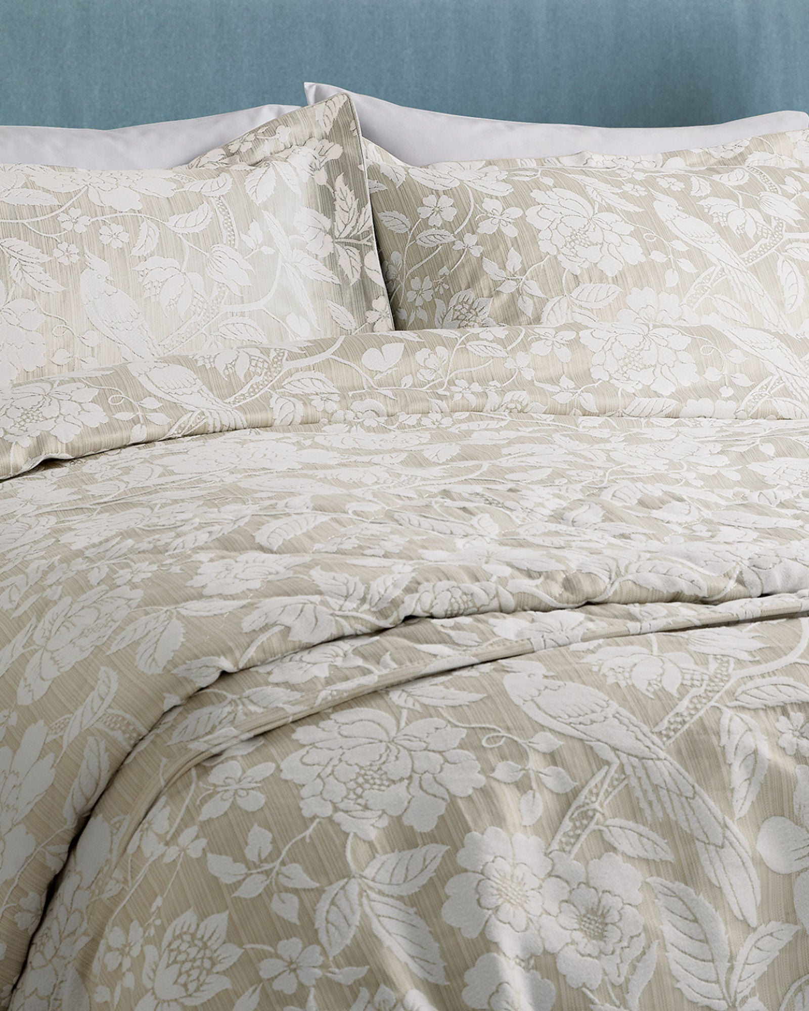 بيراموس مستوحى من وثيقة مطبوعة من القرن الثامن عشر من أرشيف ساندرسون. يتميز هذا النسيج الجاكار الكلاسيكي بطيور أنيقة ومسارات زهور على أرضية مخططة. يتميز غطاء اللحاف وغطاء وسادة أكسفورد بألوان الكتان الناعمة، وحوافهما بسيطة بخيوط رفيعة، بينما يتميز الوجه الآخر بقماش ساتان قطني بكثافة 200 خيط.