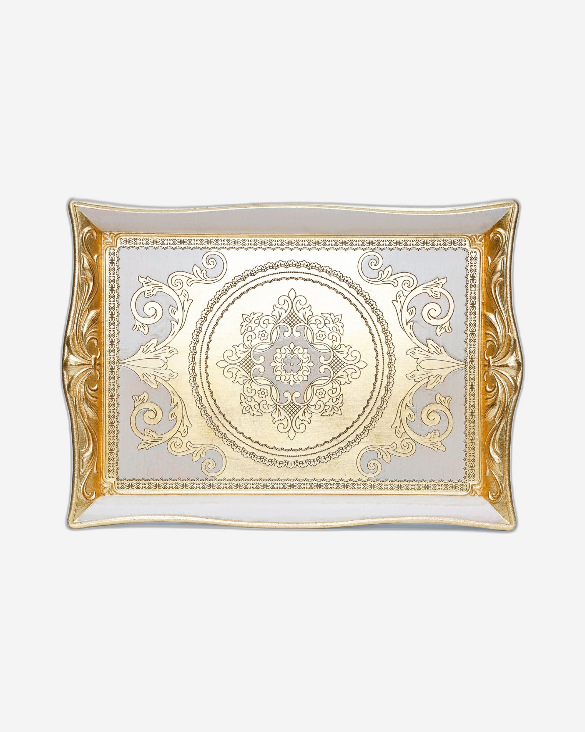 تُجسّد صينية سيزاتيني المستطيلة الكبيرة "إليزي أورو/أفوريو" جمال فنون الزخرفة الفلورنسية الخالدة، بزخارفها الذهبية الدقيقة ولمستها النهائية الأنيقة بلون أورو/أفوريو (الذهبي والعاجي). صُنعت يدويًا من أجود أنواع الخشب باستخدام تقنيات تقليدية وحديثة، لتجمع بين براعة الصنعة الإيطالية الكلاسيكية ولمسة من الفخامة العصرية. تُعدّ هذه الصينية متعددة الاستخدامات قطعة مركزية رائعة أو أداة تقديم مميزة، تُضفي لمسة من الرقي والجمال على أي منزل.