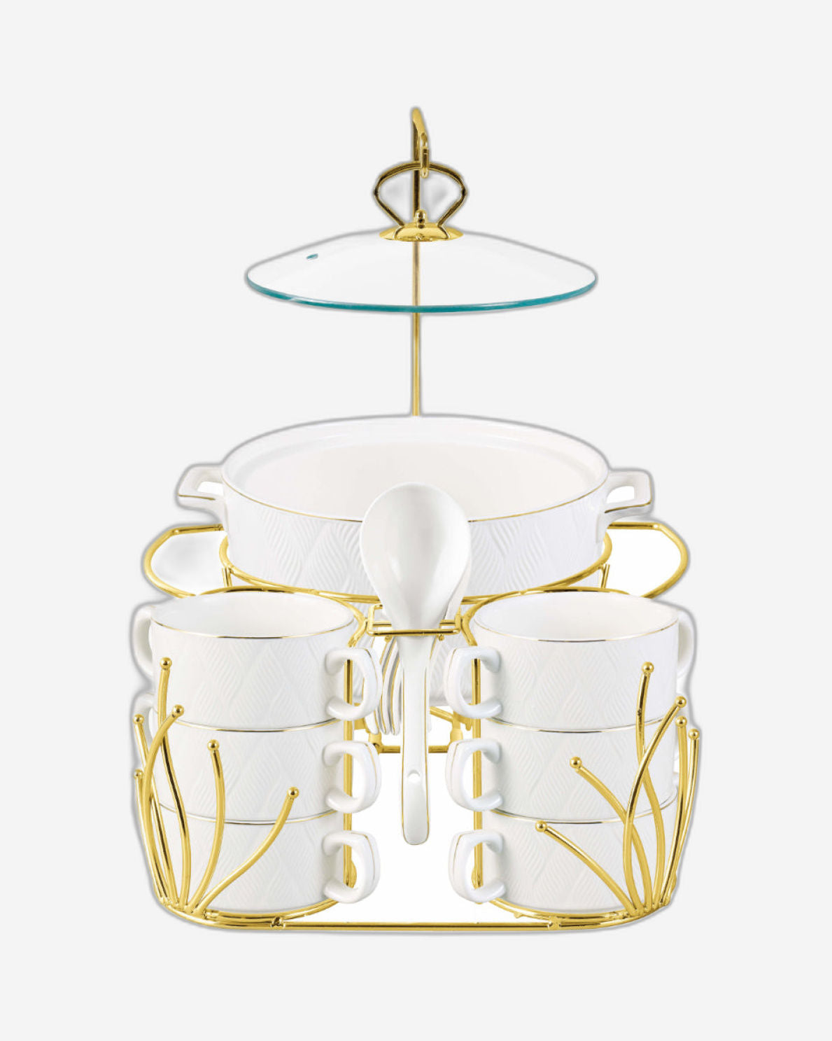 * مجموعة حساء أنيقة مكونة من 16 قطعة: تتضمن أوعية حساء من البورسلين الأبيض وحامل ذهبي فاخر لتجربة طعام راقية