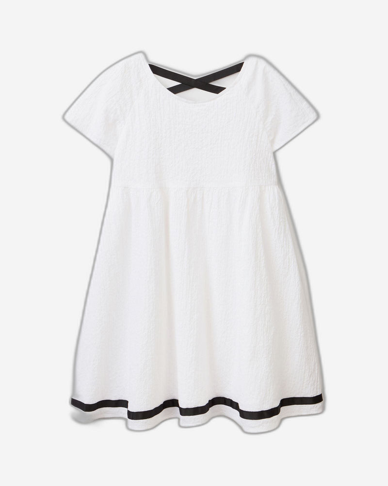 فستان قصير الأكمام واسع من القطن المرن متوسط الوزن. رقبة دائرية عميقة من الخلف، طوله فوق الركبة، مبطن بالقطن الخالص. تفاصيل زخرفية بشريط من الحرير المضلع على ظهر الرقبة وأسفل الفستان. أنثوي وأنيق، مثالي للمناسبات الخاصة.