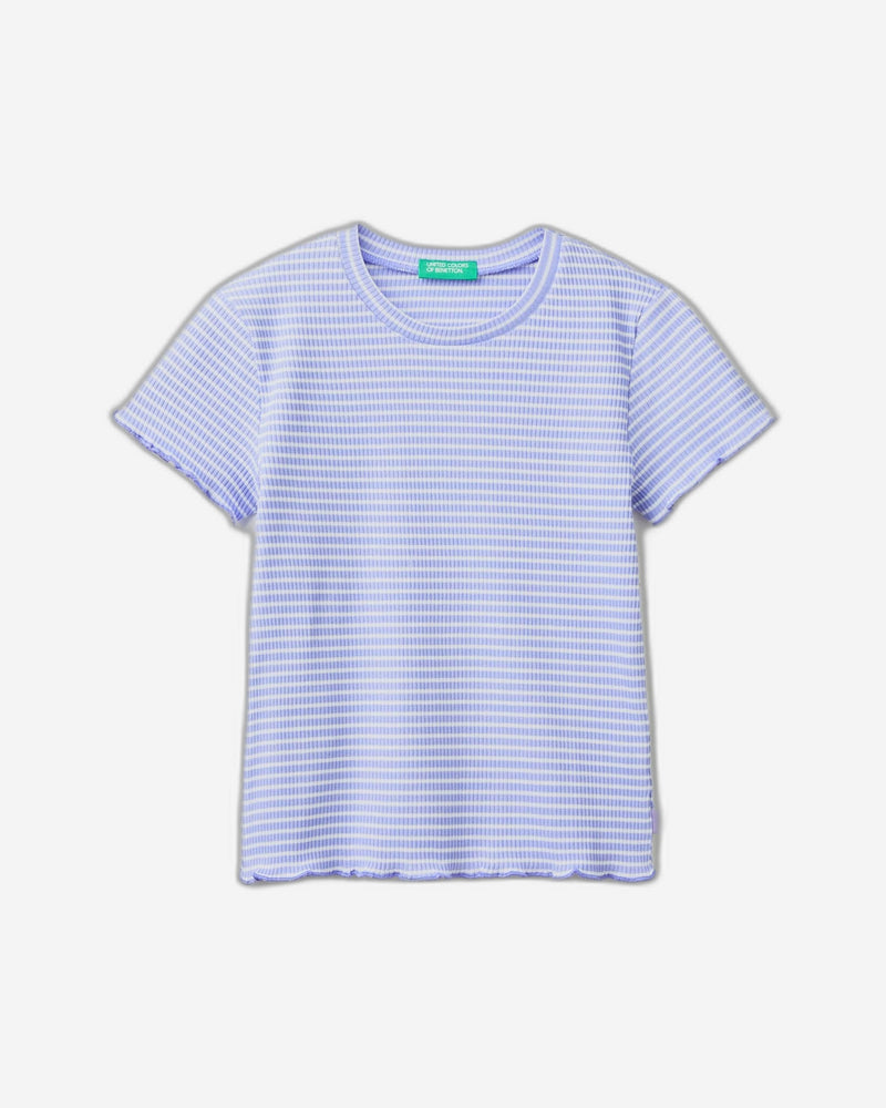 تيشيرت مضلع بياقة دائرية من القطن المرن، مزين بخطوط مصبوغة. قصة مريحة مع تطريز ناعم أسفل الأكمام وأسفل القطعة. لمسة أنثوية لإطلالاتها اليومية.
