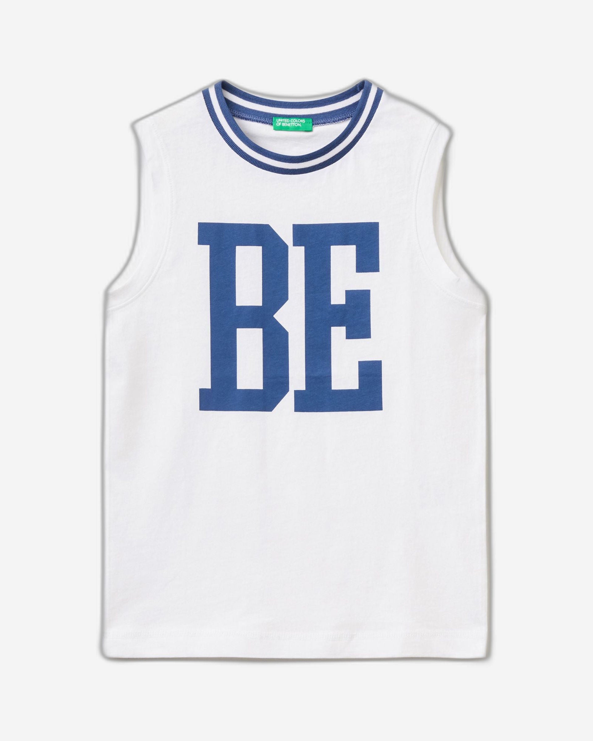تيشيرت بدون أكمام من القطن الخالص، بياقة دائرية مخططة مضلعة، وطبعة نصية ماكسي على الجهة الأمامية. مثالي لمغامرات الصيف.