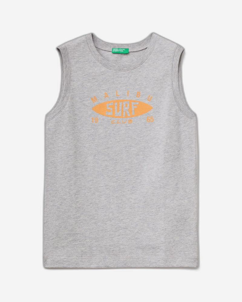 تيشيرت بدون أكمام بياقة دائرية من القطن الخالص، مطبوع عليه نص على الجهة الأمامية. يتميز بروح رياضية، مثالي لفصل الصيف.