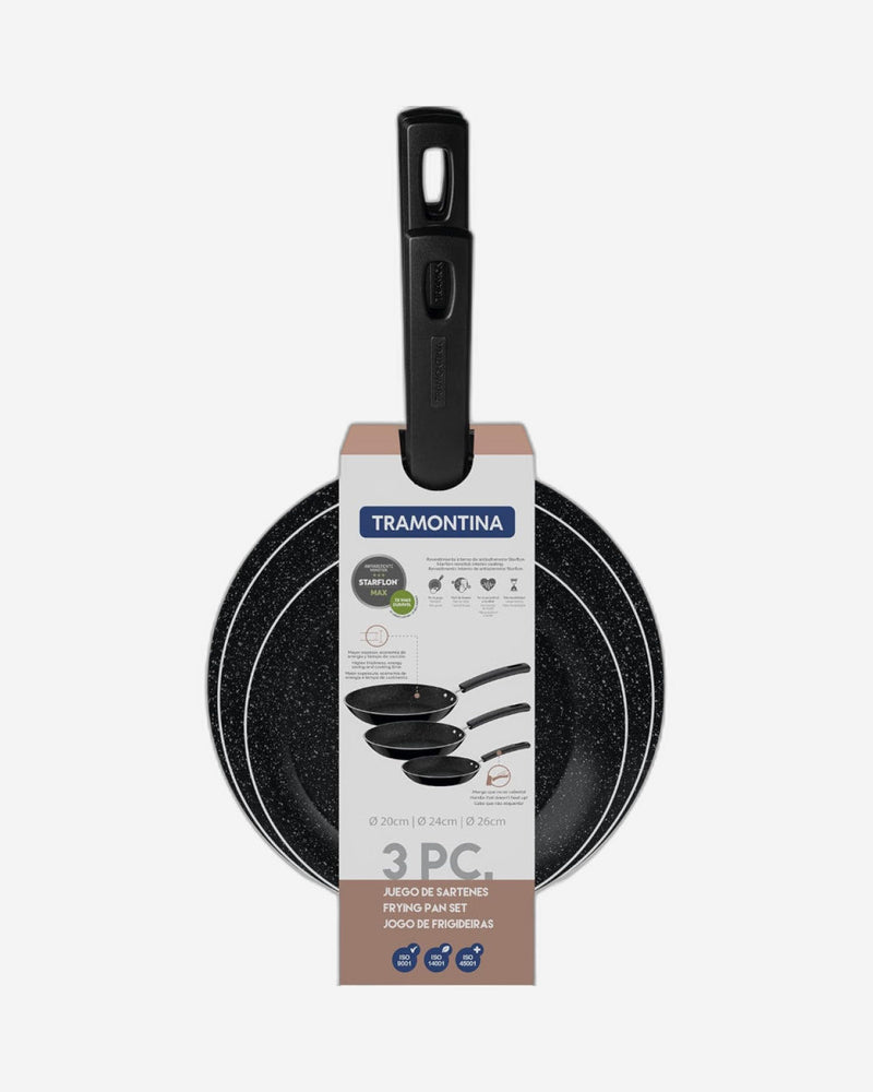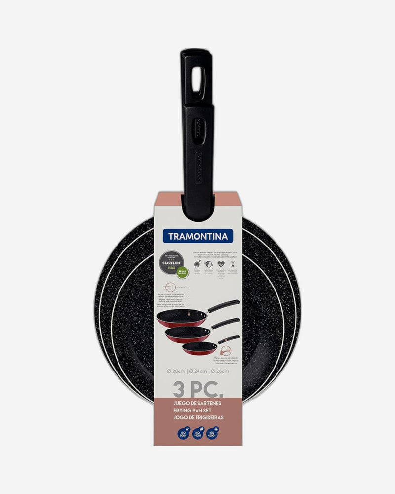 طقم مقلاة ترامونتينا برازيل تشيلسي من 3 قطع من الألومنيوم الأسود مع طلاء ستارفلون ماكس غير لاصق داخلي وخارجي خالٍ من حمض بيرفلورو الأوكتانويك (PFOA) مقاس 20 سم + 24 سم + 26 سم