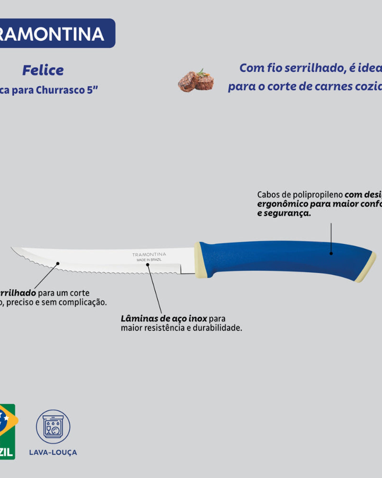 لتقطيع اللحم بسهولة أكبر خلال حفلة الشواء المميزة يوم الأحد، اعتمد على طقم سكاكين شرائح اللحم ترامونتينا فيليس المكون من قطعتين، بشفرات من الفولاذ المقاوم للصدأ ومقابض من البولي بروبيلين الأزرق. تتميز هذه السكاكين بشفرات من الفولاذ المقاوم للصدأ المعالج حرارياً ومقابض من البولي بروبيلين الأزرق لضمان جودة ومتانة عاليتين. بفضل هذه الميزات، توفر السكاكين قوة تقطيع ممتازة، بالإضافة إلى مقاومة عالية ومتانة فائقة، فضلاً عن سهولة استخدامها. يمكن غسل السكاكين في غسالة الأطباق - سهلة التنظيف للغاية!