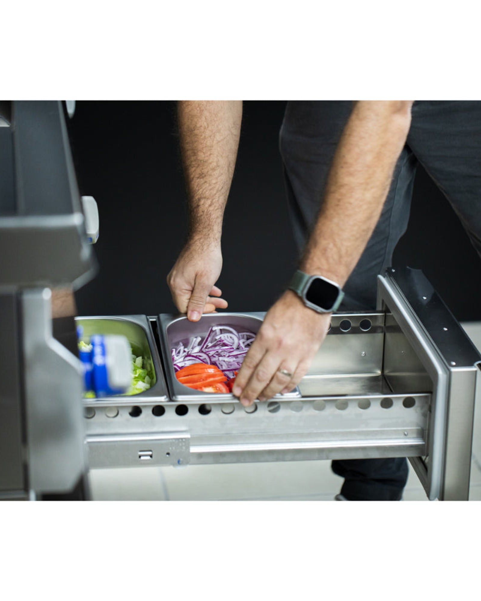 حجم GN قياسي 1/4 مع تصميم بدون مقبض لسهولة التكديس وتوفير المساحة في بيئات المطابخ التجارية.