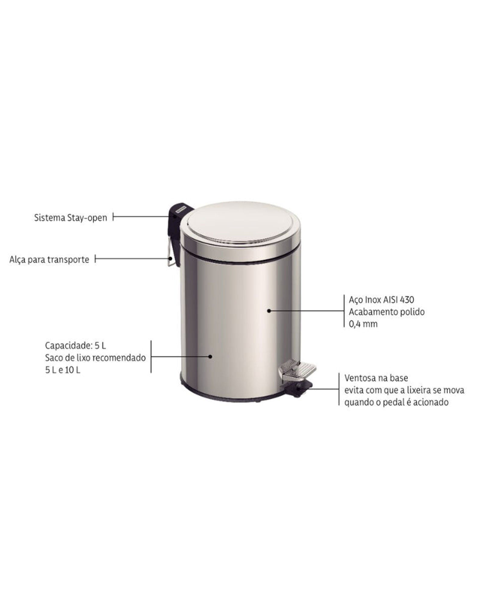 سلة مهملات ترامونتينا المصنوعة من الفولاذ المقاوم للصدأ البرازيلي، ذات الدواسة والسطح المصقول، مزودة بدلو داخلي، وهي قطعة أساسية لراحة منزلك. صُنعت في البرازيل من الفولاذ المقاوم للصدأ المصقول، بسعة 5 لترات. مثالية لأي غرفة. تحتوي على دلو داخلي، ولا تحتوي على مقبض حمل، وقاعدة مزودة بكوب شفط لتثبيتها بإحكام على الأرض. يتميز غطاء السلة ونظام فتح الدواسة بمقاومة عالية، حيث يتحملان أكثر من مليون دورة فتح وإغلاق. تساعدك هذه السلة في الحفاظ على ترتيب ونظافة المساحات لإنجاز مهامك اليومية.