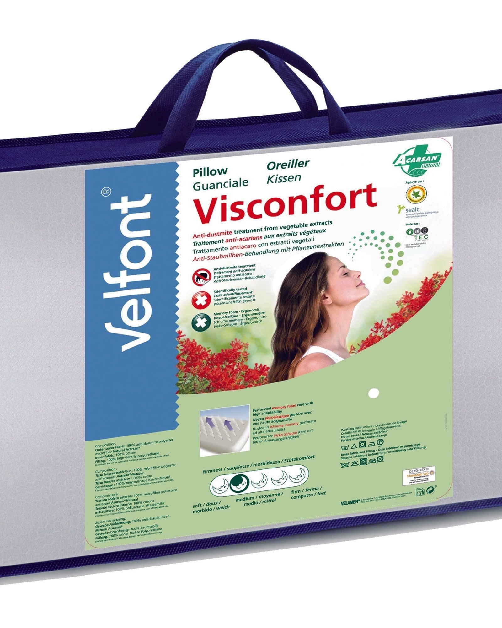 وسادة فيلفونت فيسكوكونفورت اللزجة المقاومة لعث الغبار، وسادة مريحة ومرممة، مصممة لمن يعانون من حساسية عث الغبار ويبحثون عن نوم صحي. تتميز ببطانة ناعمة من اللزجة وغطاء قطني معالج بمادة أكارسان الطبيعية، وهي معالجة مختبرة علميًا مضادة لعث الغبار وفعّالة في مقاومة الغسل. غطاء الوسادة ذو السحاب المزدوج مصنوع من ألياف دقيقة فائقة النعومة، ويتميز بتصميم منقوش لسهولة الإزالة والصيانة. تتكيف الوسادة تمامًا مع الرأس والرقبة بفضل حشوتها المصنوعة من البولي يوريثان اللزجة عالية الكثافة.