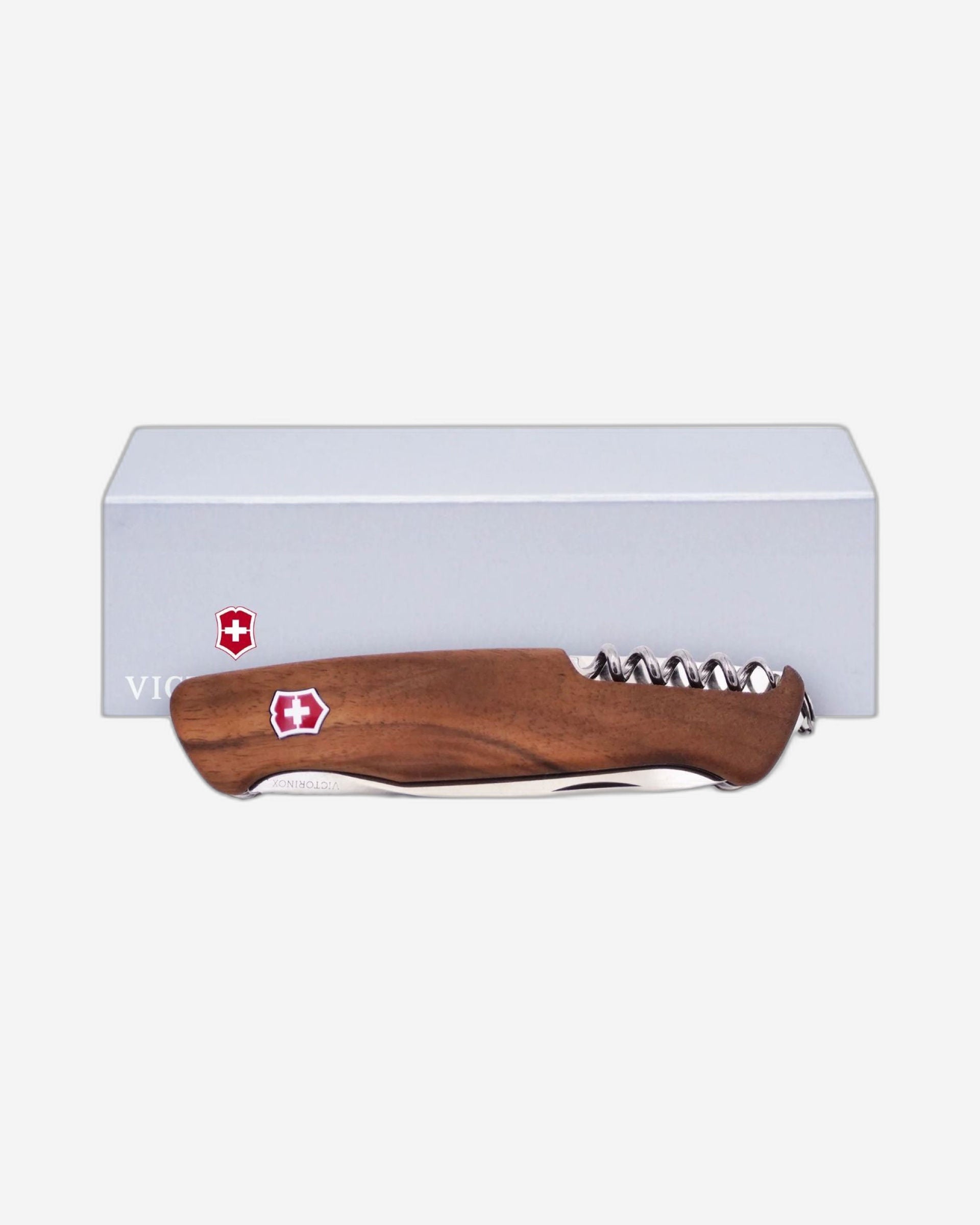 سكين Ranger 55 Wood متعدد الاستخدامات، سيساعدك على إنجاز عملك طوال اليوم. تشمل ميزاته منشار خشب وشفرة قفل كبيرة. لكن ما يميزه أكثر هو جمال مقاييسه الأنيقة المصنوعة من خشب الجوز. سكين جيب سويسري الصنع بعشر وظائف ومقاييس خشبية أنيقة.