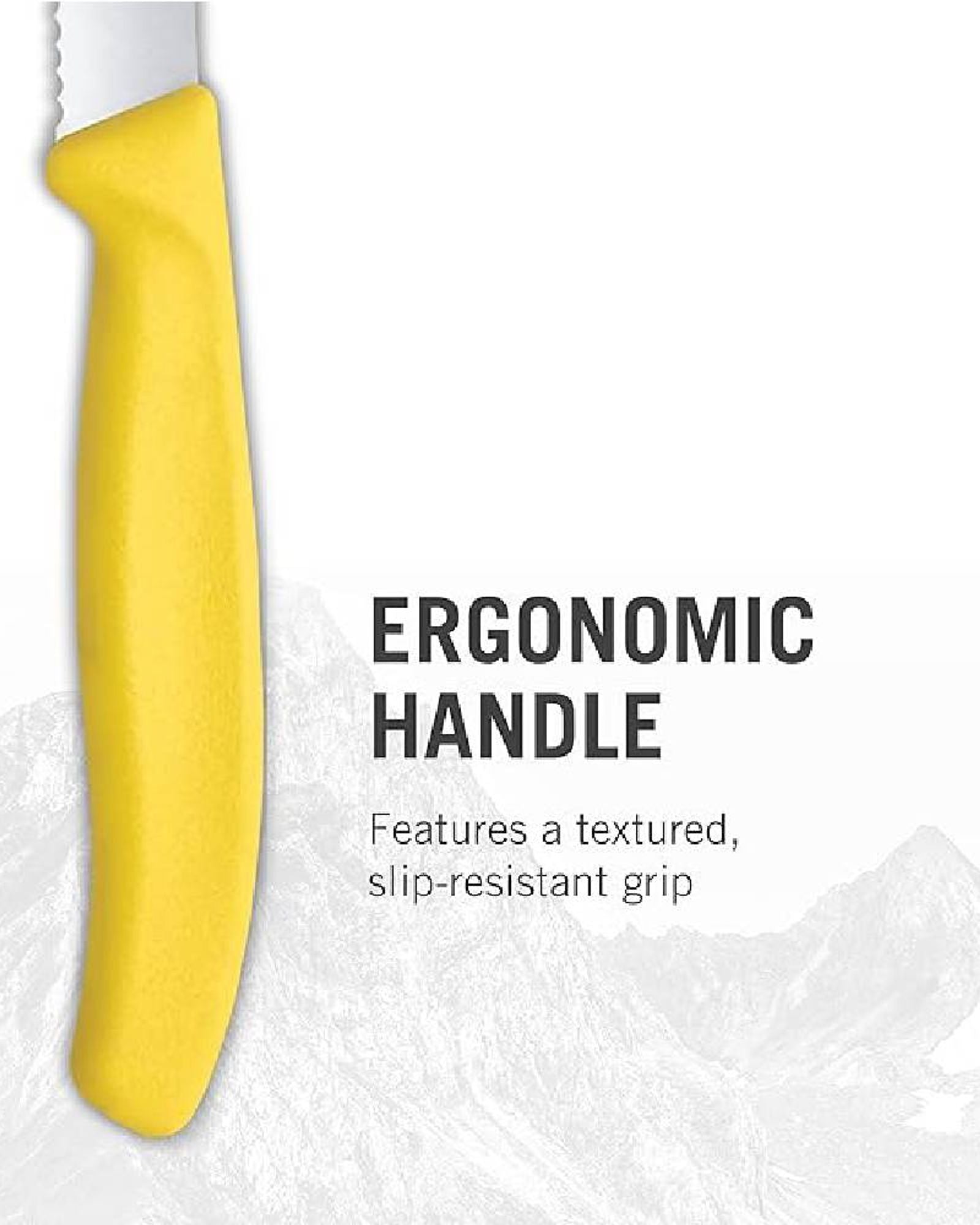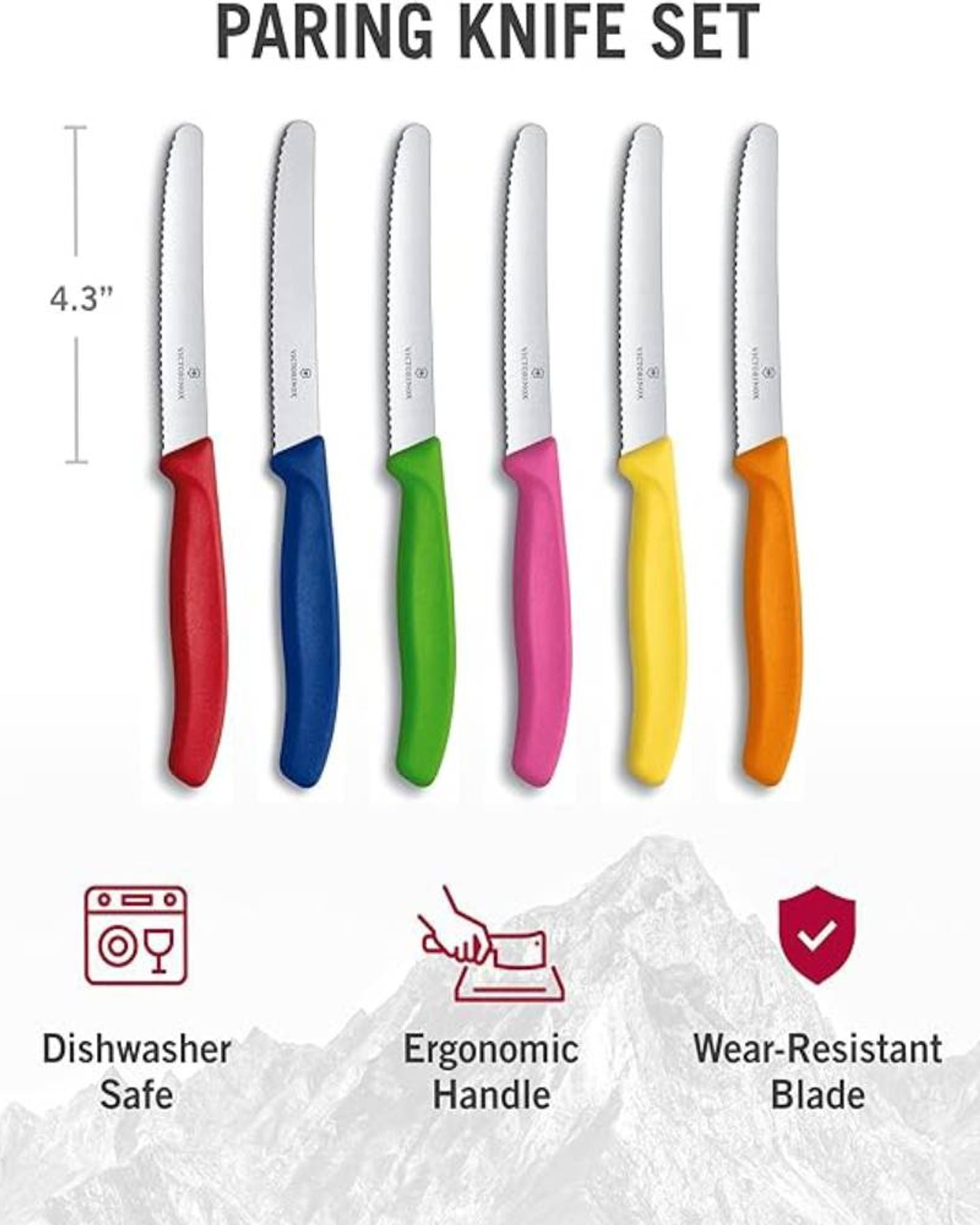 أضف لمسةً من الألوان والعملية إلى مائدتك مع سكين الطماطم السويسري الكلاسيكي الأنيق وسكين المائدة. تتميز كل قطعة من قطع هذه المجموعة الست بحافة متموجة فائقة الحدة مصممة لتقطيع شرائح اللحم والبيتزا بسلاسة. وبفضل مقبضها المريح وحجمها المثالي، يمكنك استخدامها لتقطيع أي شيء آخر في المطبخ أيضًا. تتميز هذه المجموعة بتصميمها العملي، مع لمسة من المرح بألوانها الجذابة من الأخضر الفاتح والأزرق والأحمر والأصفر والوردي والبرتقالي، مما يضفي لمسةً من البهجة على أي مطبخ وعلى أي مائدة.