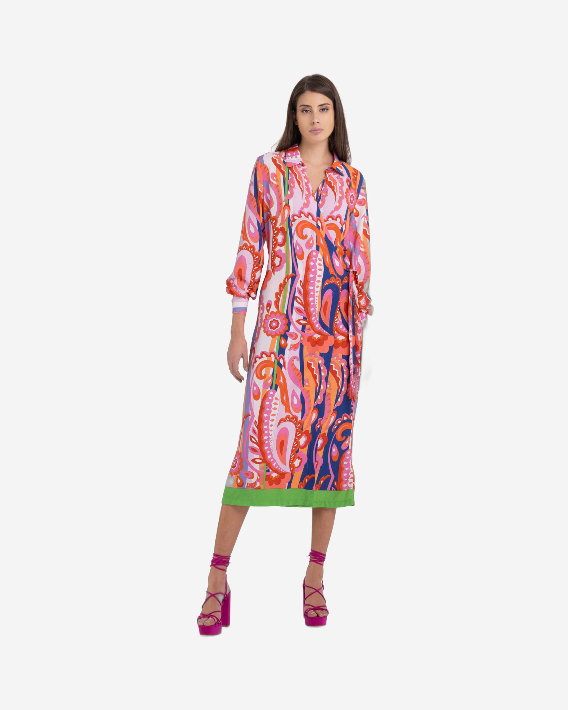 فستان قميص من الفيسكوز بطبعة زهور تغطيه بالكامل. بأكمام طويلة، يتميز بفتحة رقبة على شكل حرف V مع تقاطع جانبي، وحزام مربوط على جانب الخصر. طوله تحت الركبة.
